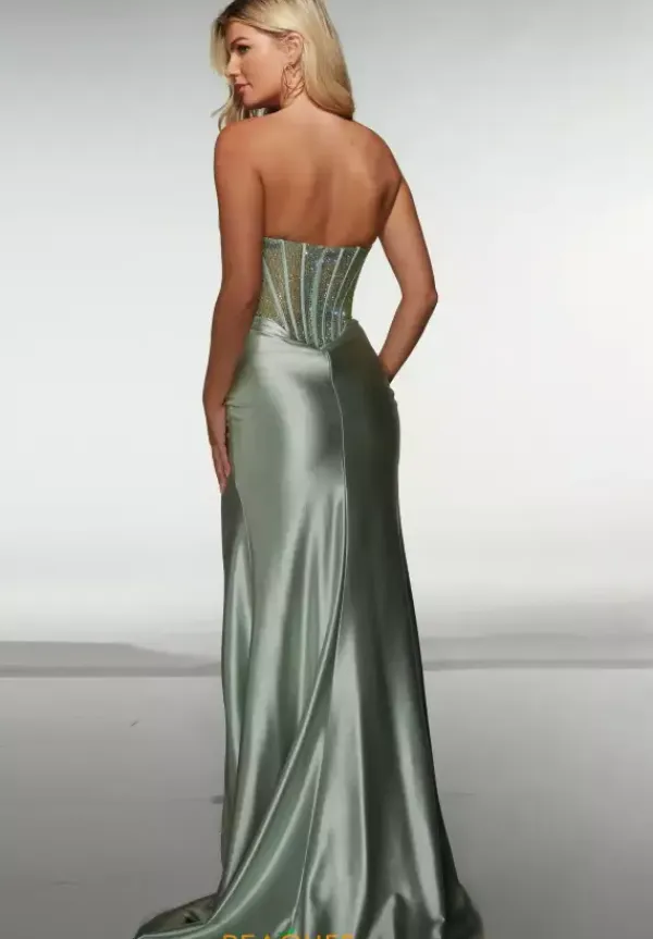 Look unreal in this must have Alyce Paris form fitting prom dress style 62177. The fabulous stretch satin ensemble grips onto every curve and displays a flawless satin sheen across the pleated sweetheart neckline and smooth sweep length skirt. The glittering corset bodice has a discreet zipper closure.