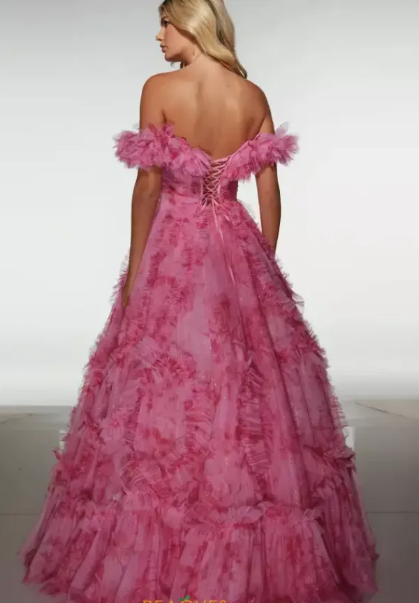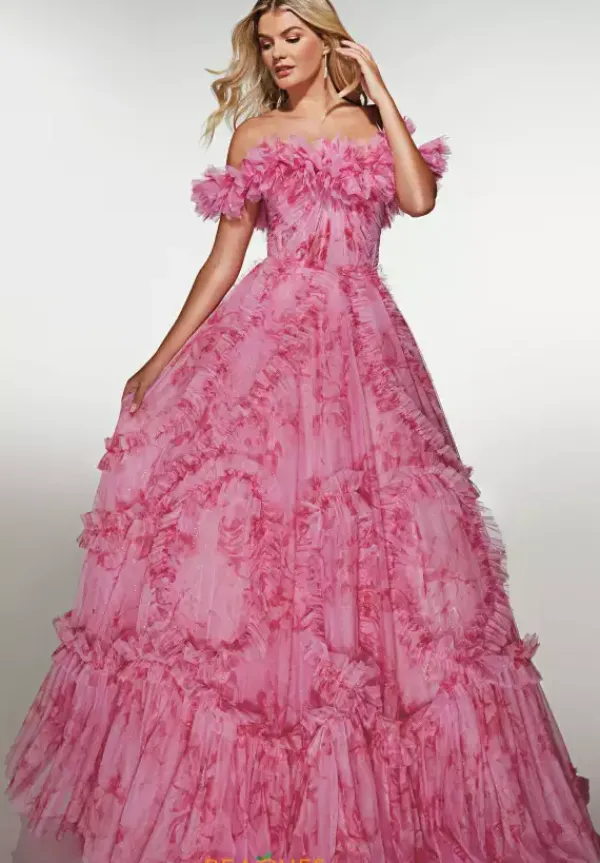 Be the belle of the ball in this gorgeous printed Alyce Paris a line dress style 62216. Available only in this pink tone color, this strapless dress has a straight across neckline with off the shoulder cap sleeves. The rim of the bodice is made from a ruffled tulle material. The full a line skirt has skirts of ruffled material throughout.