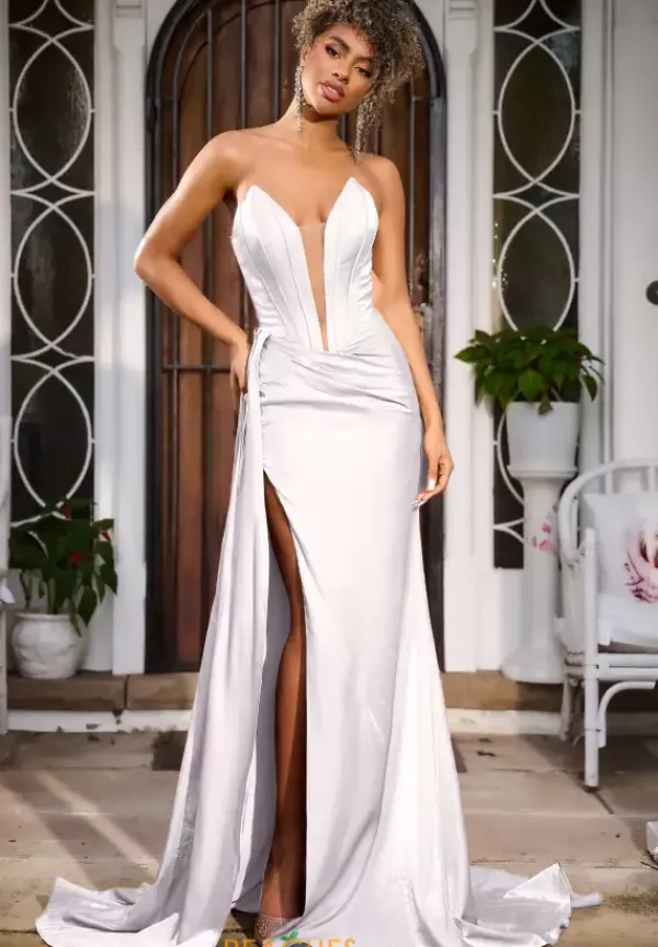 Make heads turn at your next event in this extremely captivating gown by Portia and Scarlett PS24634E. Featuring a flashy plunging v cut strapless neckline and a corset flattering bodice. fitted silhouette is made to hug your curves and accentuate your curves. A simple overskirt is added to the side of the gown along with a slit for just the right amount of glam.