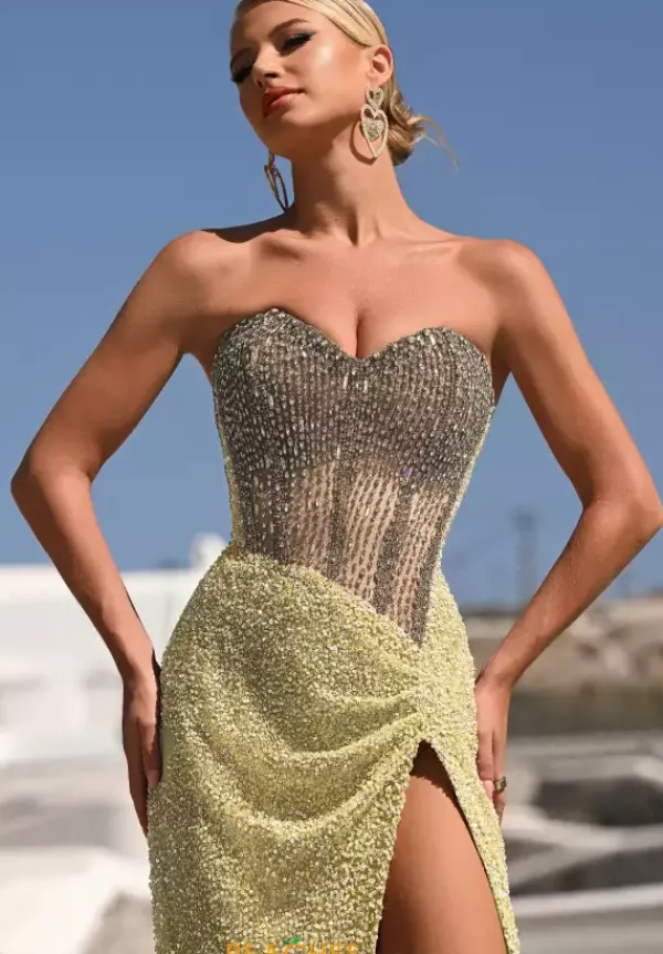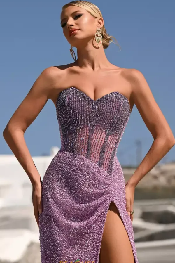 Look ready to attend the met gala in this extra glamorous, eye catching long Portia and Scarlett gown style PS24850C. Showcasing a strapless sweetheart neckline adorning the flattering corset bodice. This full shimmer gown is perfect to have you stand out and look like a superstar. A sexy thigh high slit and long train are added to complete this elegant look.