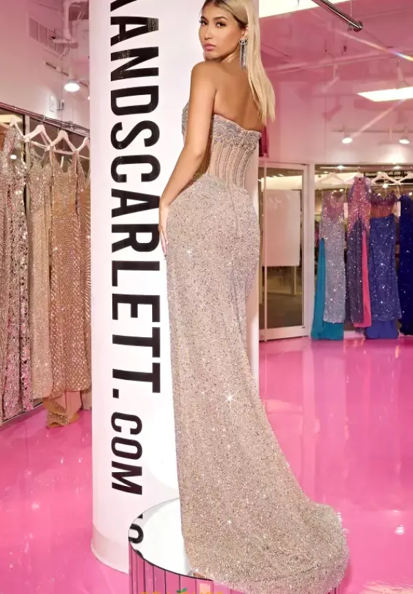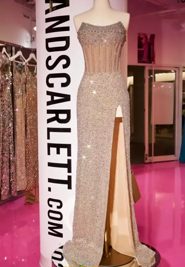 The perfect gown for any social event, long style PS24877C by Portia and Scarlett will have heads turning. The strapless neckline is paired with a waist snatching illusion corset bodice embellished with a delicate display of hand sewn beading. Showcasing the entire fitted silhouette that is delicately adorned along the skirt with sequin that will have you illuminating.
