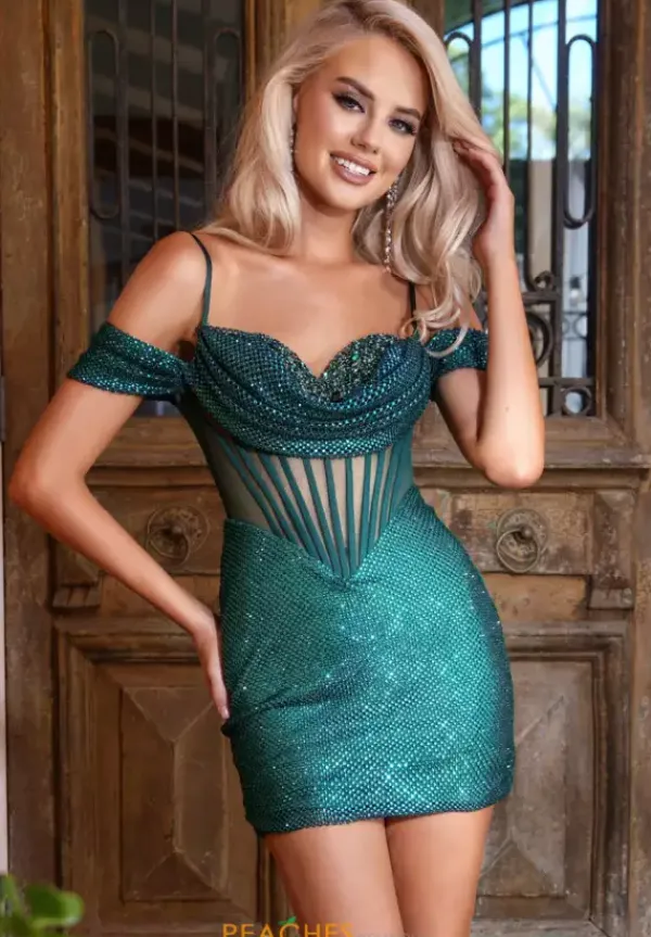 Have all eyes on you when wearing this elegant short fitted dress by Portia and Scarlet style PS25141. It consists of sweetheart neckline with thin straps and adding a classy touch to this number is the glamorous overlay on the cups that makes a soft transitions to the sparkling off the shoulder cap sleeves. Featuring a see through corset back zipper bodice with exposed boning that dips into a v shape towards the fully beaded bottom.