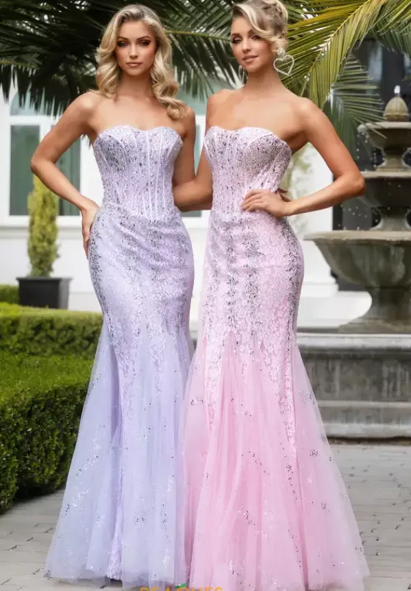 Feel like you just step foot of the red carpet when wearing this magnificent long dress by Portia and Scarlett, style PS25169. Showcasing a fitted mermaid silhouette with a strapless sweetheart neckline. The corset bodice is fully adorned with glistening beadwork that cascades down the dress.
