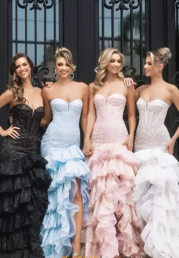 Feel like a modern day princess when wearing this enchanting long dress by Portia and Scarlett, style PS25250. Featuring a fitted mermaid silhouette with strapless sweetheart neckline. This ensemble is made out of novelty material and beautiful beadwork. A thigh high slit on the the ruffled skirt is the perfect final touch.