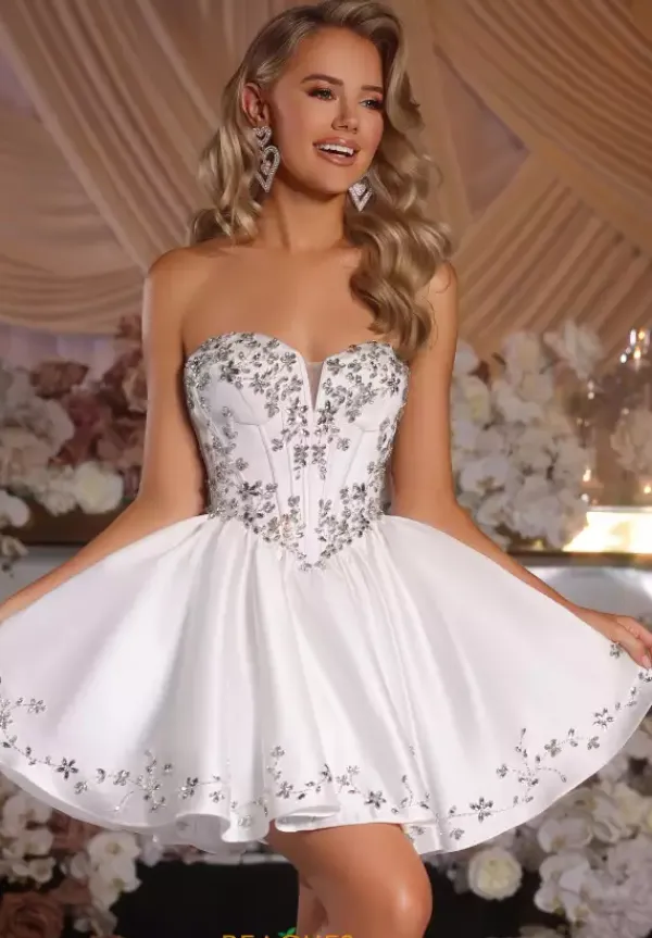 Feel like a modern day princess in this enchanting short dress by Portia and Scarlett, style PS25567. Featuring an a-line silhouette with a strapless sweetheart neckline. The corset bodice is adorned with dazzling beadwork that matches the beadwork along the bottom of the skirt. A corset lace up back is the perfect final touch.