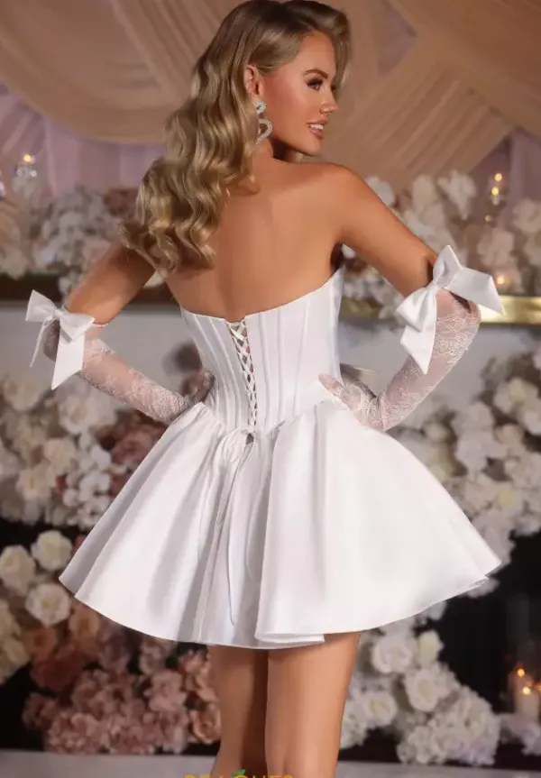 Sexy and elegant are the first words that will come to mind when people see you wear this gorgeous short A line dress by Portia and Scarlett, style number PS25568. This stunning dress features a classic strapless sweetheart neckline with a plunging mesh cut out in the center for a little extra spice. The dainty bow that adorns the waistline combines timeless elegance with modern charm.