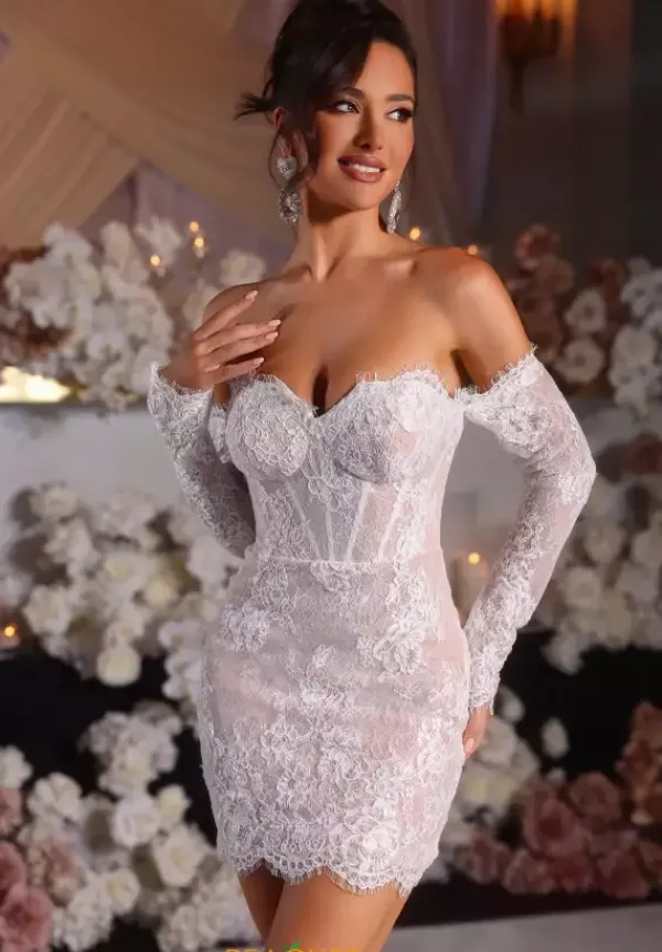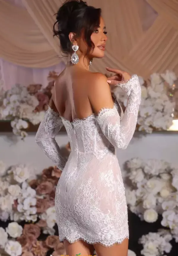 Fall in love in this extravagant short lace Portia and Scarlett style PS25570. Exude elegance in this gorgeous ensemble adorn in lavish lace highlighting lovely scallop trimming. Showcasing a strapless sweetheart neckline, edgy off the shoulder long sleeves give this dress a dramatic touch. The fitted short silhouette defines your waistline accentuating your curves.