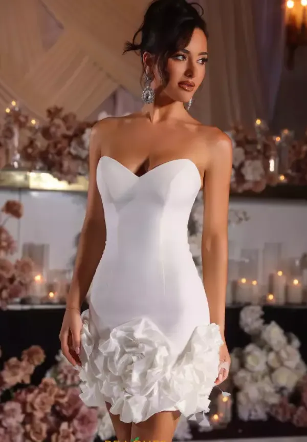 Less is definitely more especially when wearing this classy one of a kind short dress by Portia and Scarlett, style PS25669E. Featuring a fitted silhouette with a strapless sweetheart neckline. This number is made out of novelty material that hugs the body gorgeously. The bottom of the skirt has a beautiful floral design.