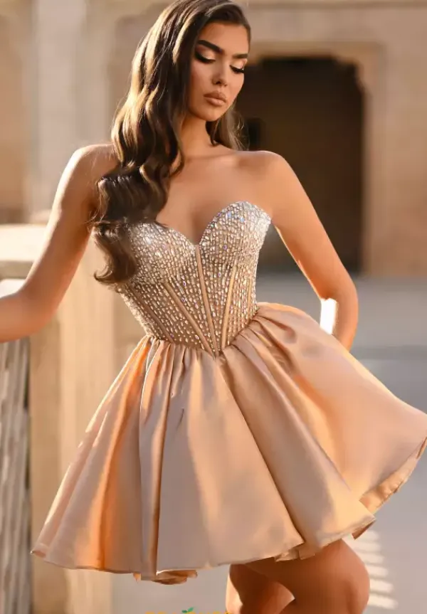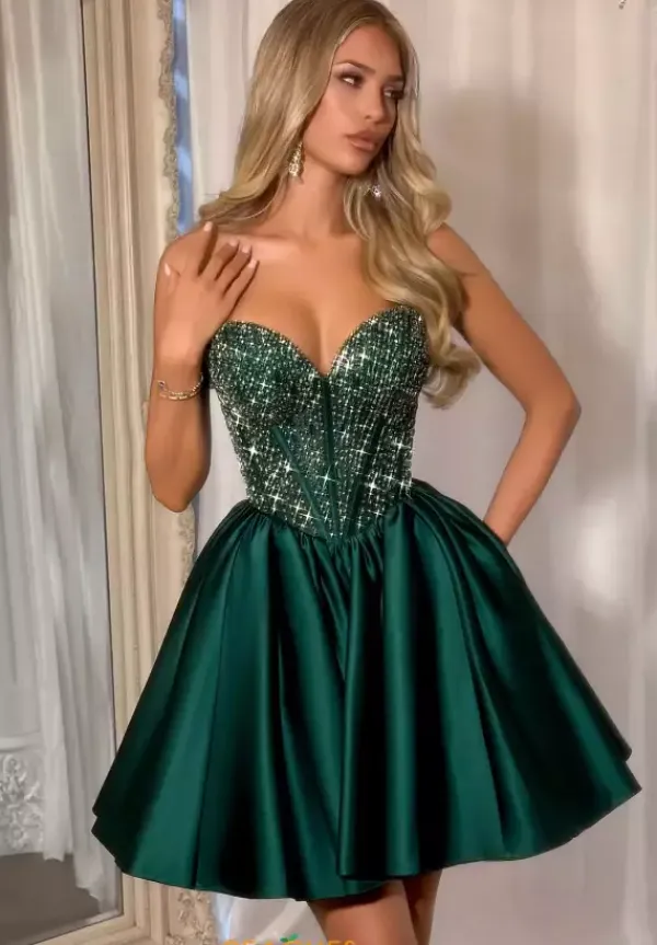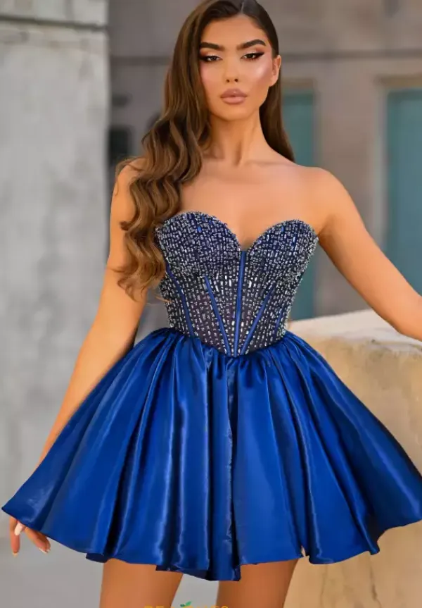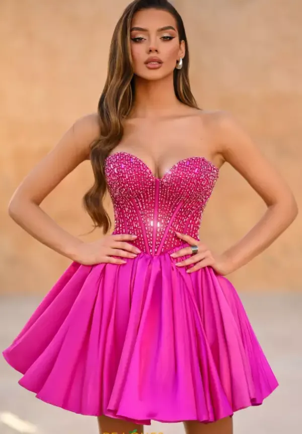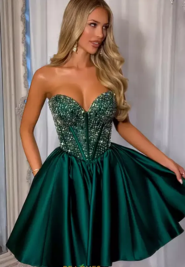Exude confidence this short A line Portia and Scarlett dress, style PS25711. This gorgeous dress features a marvelous beaded corset with a lovely strapless sweetheart neckline. Made from silk satin material, you will be able to dance comfortably throughout the night. Show off your figure with this corset that hugs your body and be the talk of the night.