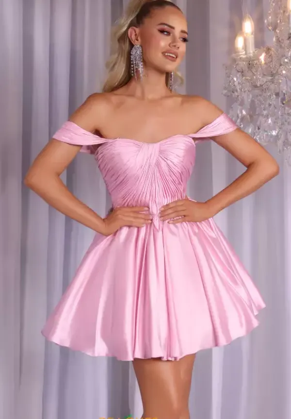 Sweet and elegant is this Portia and Scarlett short a line dress style PS25725. This dress features a scoop neckline bodice with off the shoulder cap sleeves. The bodice is ruched to meet in the center to make it ultra flattering. The satin a line skirt flows from the small of your waist with just the right amount of fullness.