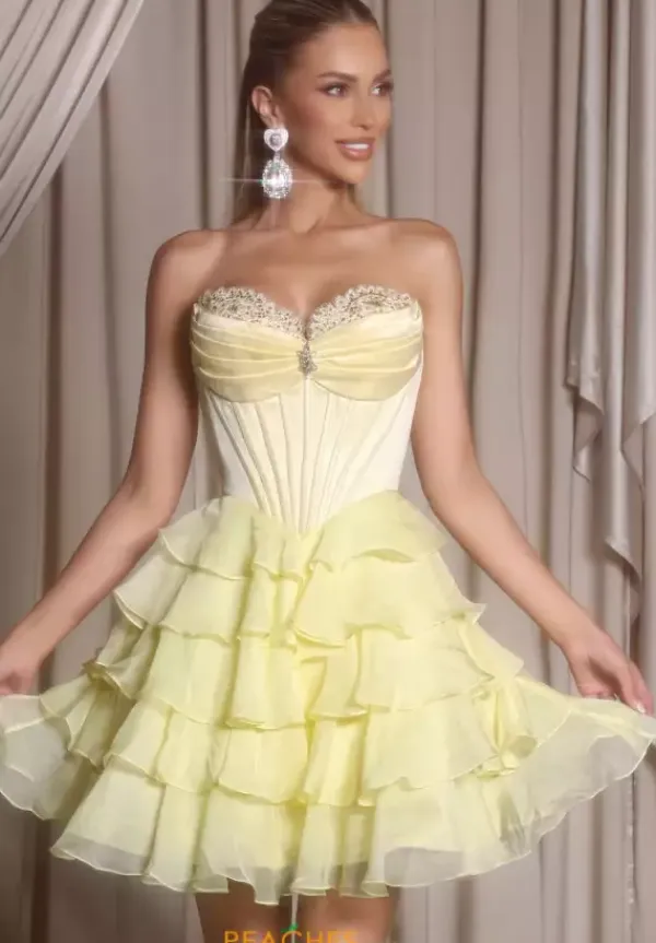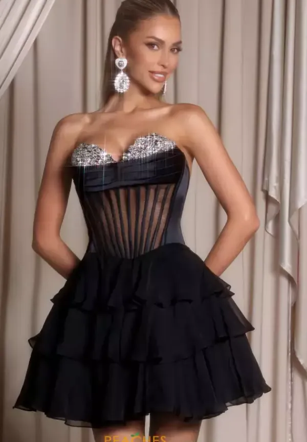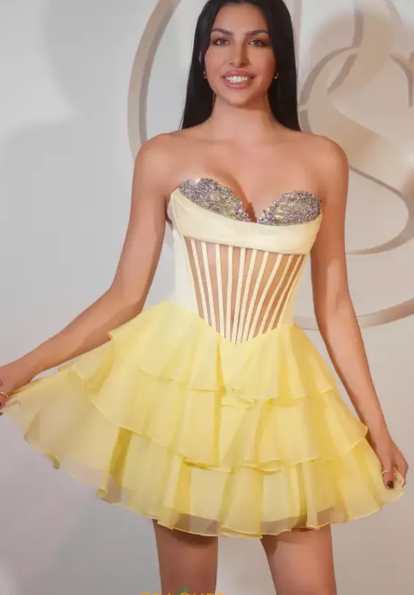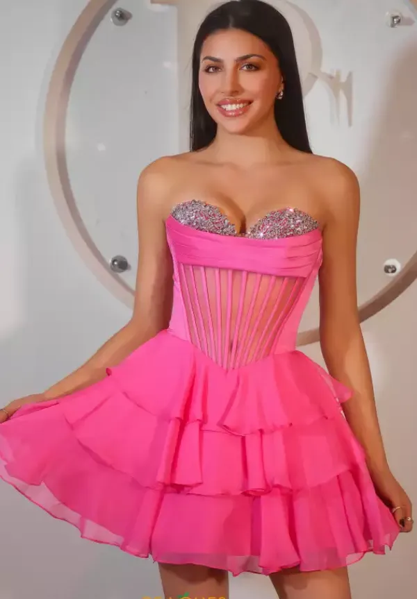 Dance the night away in this flowing a line dress from Portia and Scarlett style PS25799. Available in gorgeous colors, this strapless sweetheart neckline dress is bedazzled with rhinestone beading along the bust. The long waisted bodice has a sheer illusion in the center with exposed boning. The soft chiffon layers the a line skirt.