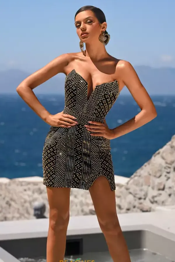 Look red carpet ready in this show stopping short fitted dress by Portia and Scarlett style number PS25821C. This dress features a classic strapless V neckline with a structured corset bodice that accentuates your figure flawlessly. The whole dress is adorned in sparkling beadwork that forms gorgeous intricate patterns that will have all eyes on you.