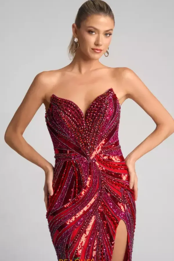 Bedazzle the crowd in this long fitted Portia and Scarlett dress style PS25984C. This v neckline strapless dress is beaded with exquisite detailing. The combination of rhinestones, beads and sequin swirl perfect throughout the dress. A front thigh high side slit and sweeping train complete the look. This is the long dress in the middle.