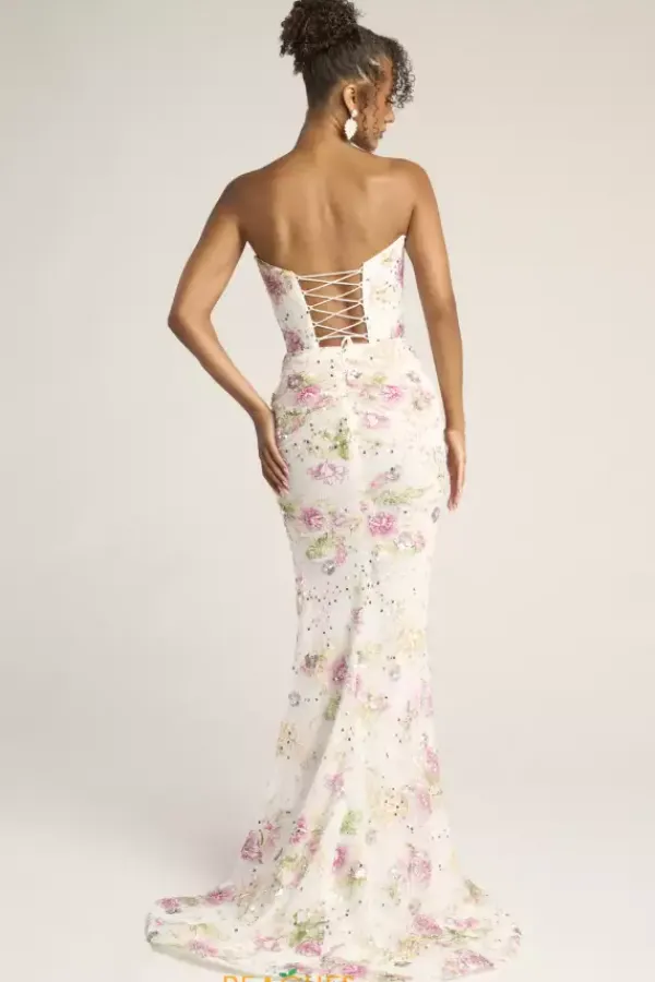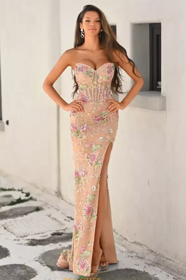 Exude timeless elegance in this stunning long fitted dress designed by Portia and Scarlett style, PS26021. Featuring a strapless sweetheart neckline and an outstanding corset with a flattering lace up back. This entire dress is detailed with a mix of dazzling beadwork, sequins and applique. A thigh high slit and a lovely long train is the perfect final touch.
