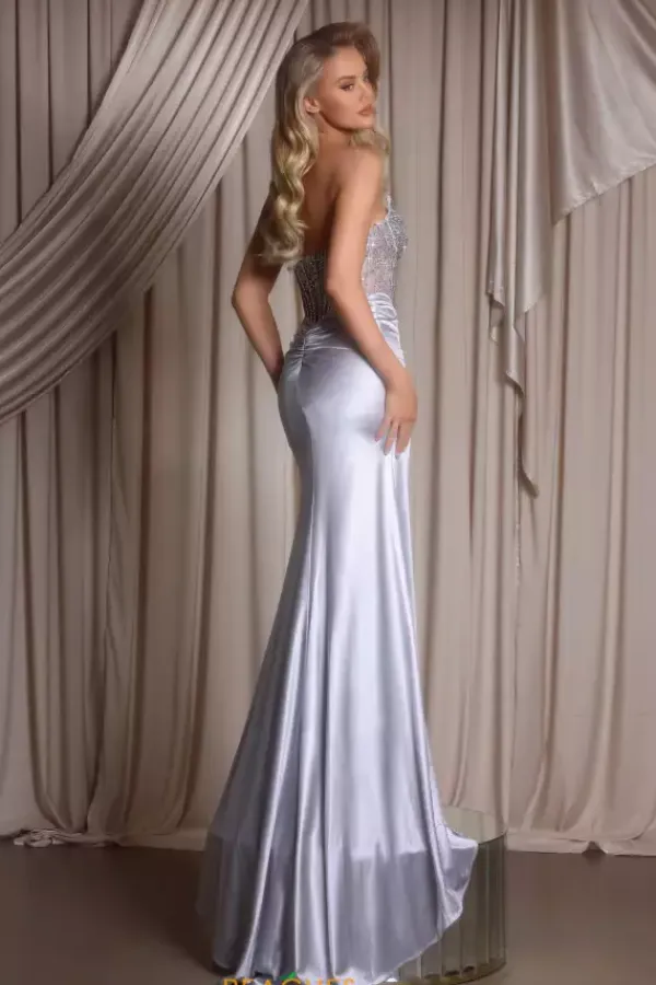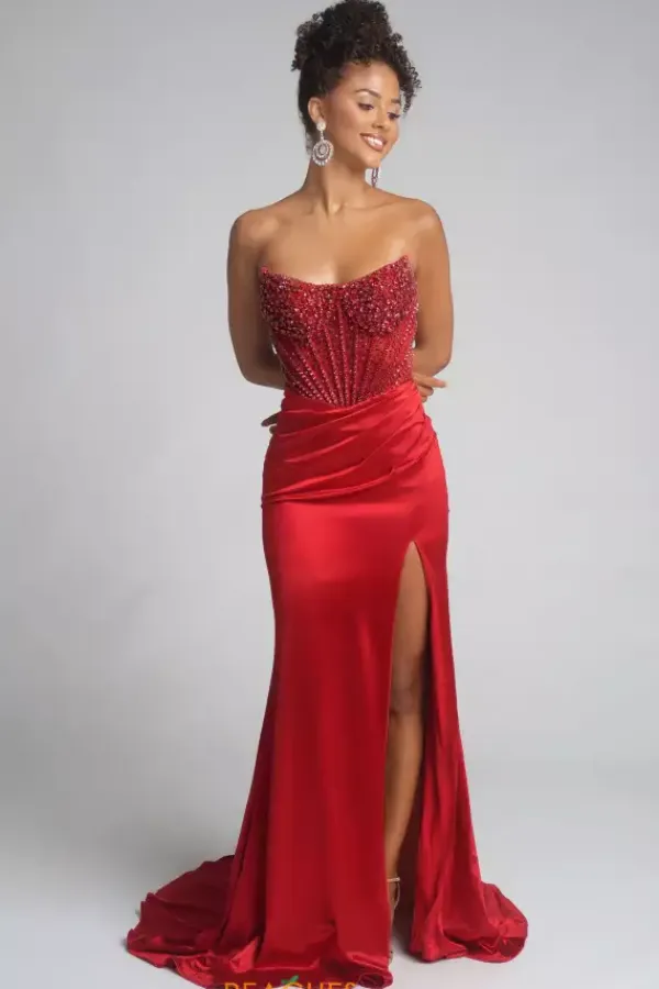 Look picture perfect wearing Portia and Scarlett long dress PS26041. This striking fitted dress showcases a fierce scoop strapless neckline paired with a vibrant beaded corset bodice accentuating your figure beautifully. The shiny simple satin skirt reveals a thigh high slit and must have sweep train to follow you gracefully.