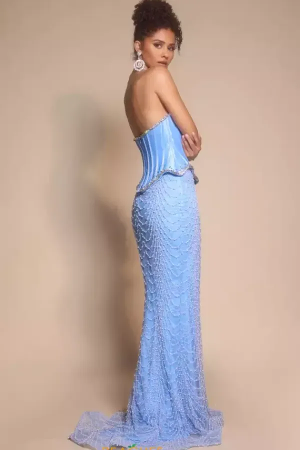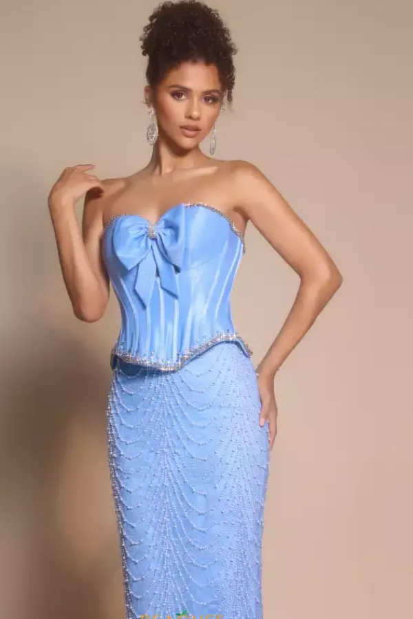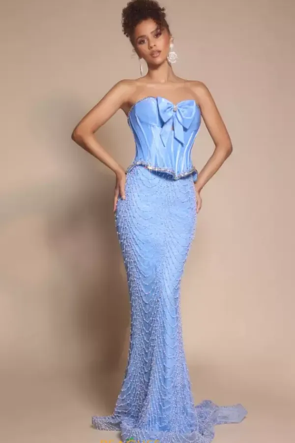 Achieve that celebrity look as you wear this mesmerizing long fitted dress designed by Portia and Scarlett PS26054. Featuring a strapless sweetheart neckline detailed with a dainty bow and a fitted corset bodice. The skirt is entirely embellished in dazzling lace material and beadwork. Have your red carpet moment as the train lays gracefully behind you.