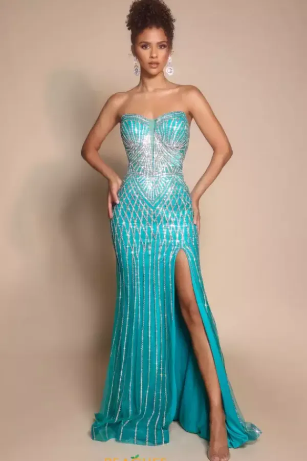 Walk in and strike a pose wearing Portia and Scarlett long dress PS26072. This absolutely striking fitted dress showcases a flattering sweetheart strapless neckline with a full zip up closure unique patterns of intricate beads and sequins add the perfect amount of sparkles ensuring you stand out effortlessly.