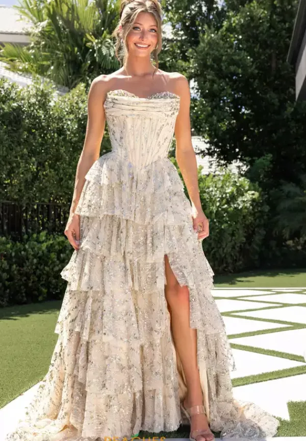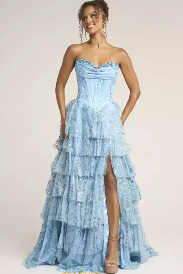 Be the most memorable in this unforgettable Portia and Scarlett ball gown style PS26099. Eye catching color matching stone accents garnish the strapless sweetheart neckline of the sequin beaded corset bodice. Frilly sequin encrusted tiers of glittering tulle cascade into a lavish sweep train.