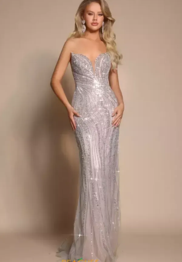 Look like a fashion forward diva in this glamorous long fitted dress designed by Portia and Scarlett style, PS26106. This piece showcases a strapless V neckline with a corset lace up back. This stunning silhouette is entirely adorned in captivating beaded patterns. Strike a pose with the exquisite thigh high slit revealing a phenomenal long train.