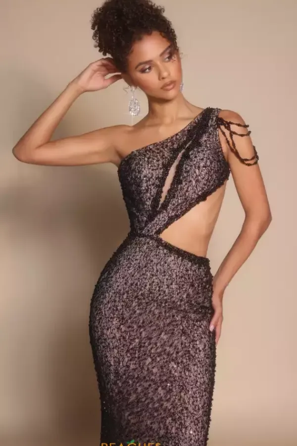 Steal the spotlight at your special event in this mesmerizing long fitted dress designed by Portia and Scarlett style, PS26115. This unique dress features an eye catching off the shoulder single strap shoulder with a dazzling beaded cap sleeve. The bodice has a midriff and side cutout for a seductive look. The skirt then flows down into a stunning train.