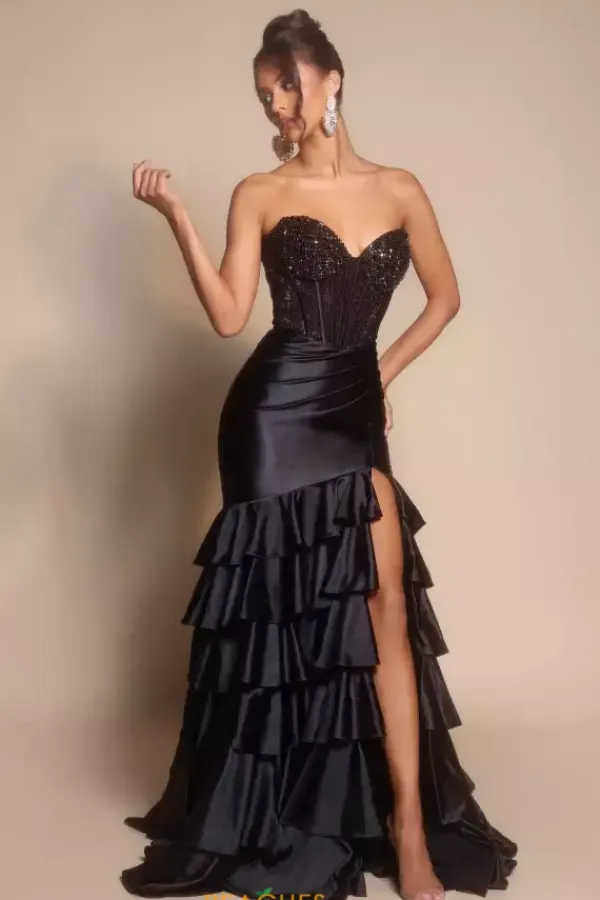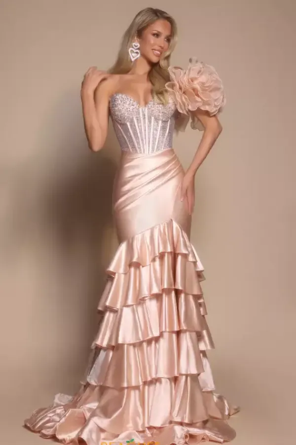 Show up and stand out at your next event in this chic long fitted dress designed by Portia and Scarlett style, PS26141. Featuring a strapless sweetheart neckline paired by a single shoulder detailed cap sleeve. The corset is adorned in dazzling beadwork leading down to a luxurious stretch satin skirt with ruffle layers. Finish off this look with the superb slit and long train.