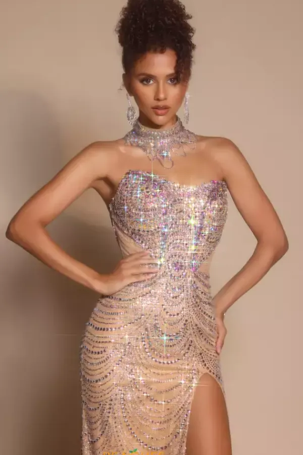 Have no competition when you wear this pageant worthy Portia and Scarlett fitted floor length dress style PS26199. Exquisite drape fashioned beading dazzles radiantly throughout the lengthy skirt to perfectly match the beaded draped choker. The strapless bodice is garnished in various sizes of high quality beads.