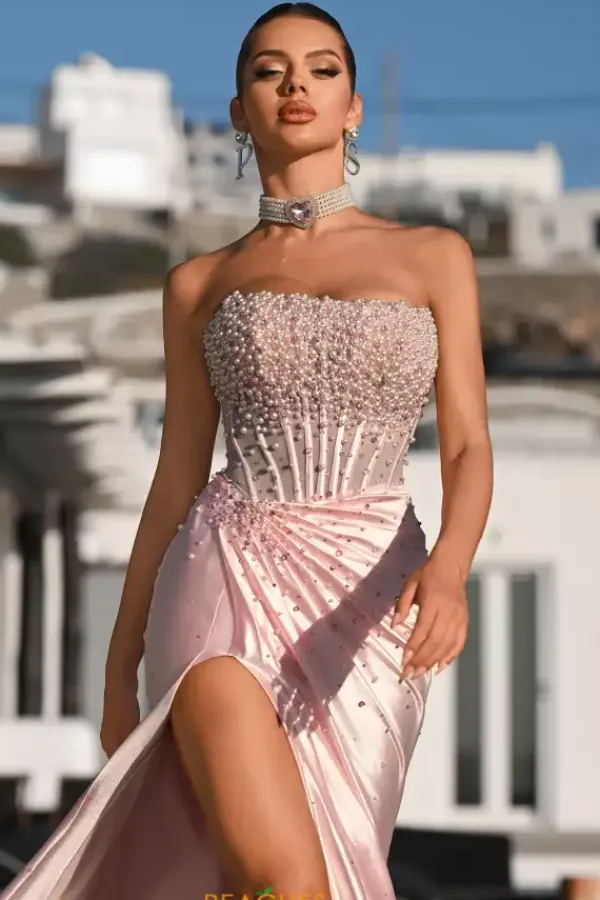 Turn heads at prom in this shimmering Portia and Scarlett long dress style PS26235 drenched with pearls and stones on stretch satin fabric. This glistening gown showcases a strapless, sheer corset with a straight across neckline, exposed boning and low back. The long slim skirt, has ruching to one side, a high front, side slit and small back train.