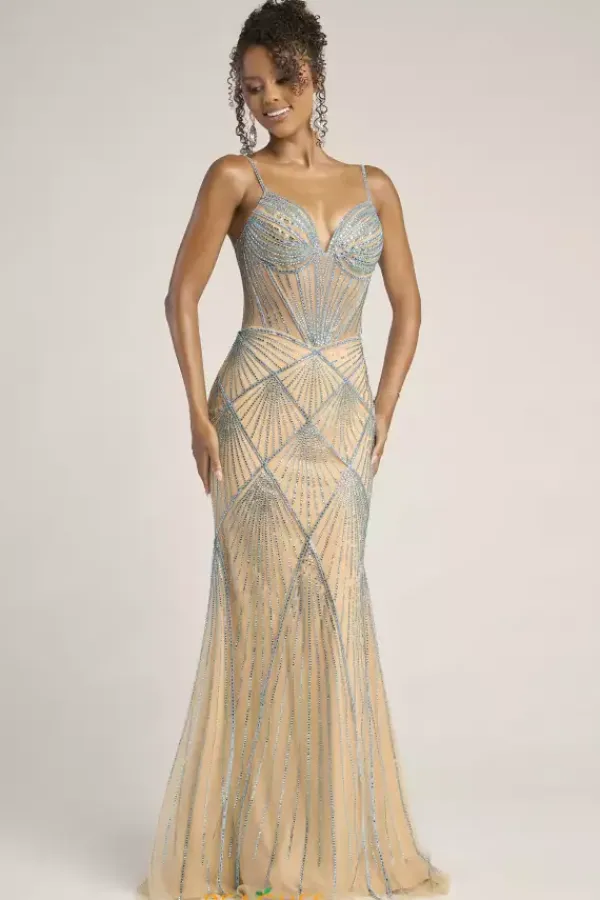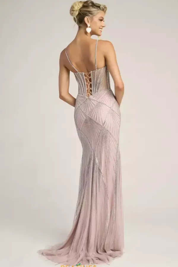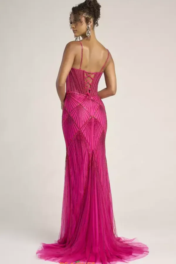 You will not go unnoticed when this bedazzled Portia and Scarlett Prom dress style PS26263 shines from every angle. This zipper closure corset dress is supported by dainty spaghetti straps that match the beadwork of the deep v neckline and mimicking beadwork of the bodice. Diamond shaped patterns shimmer throughout the sweep train skirt.