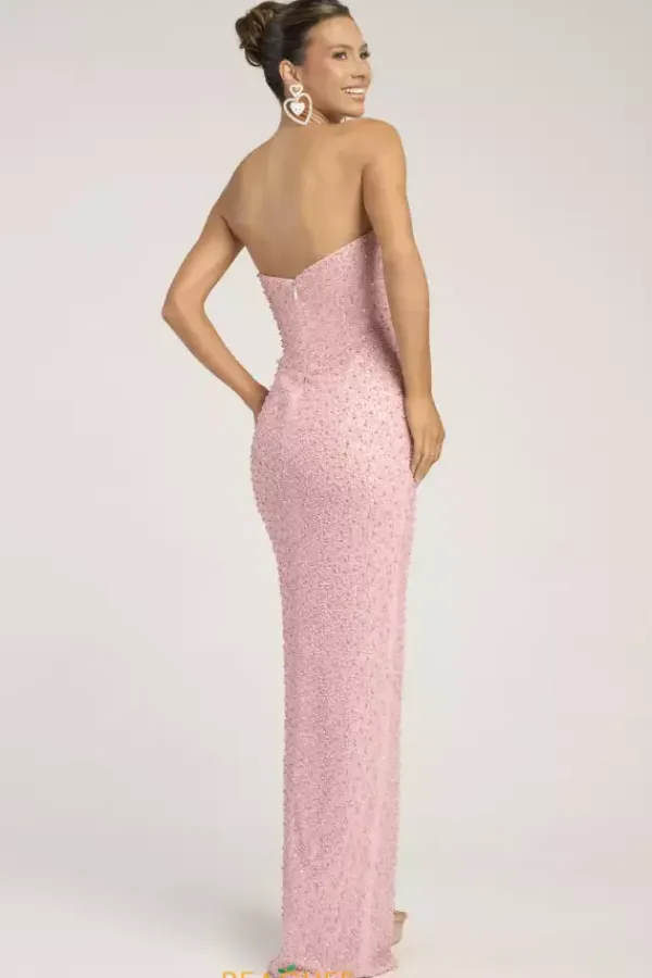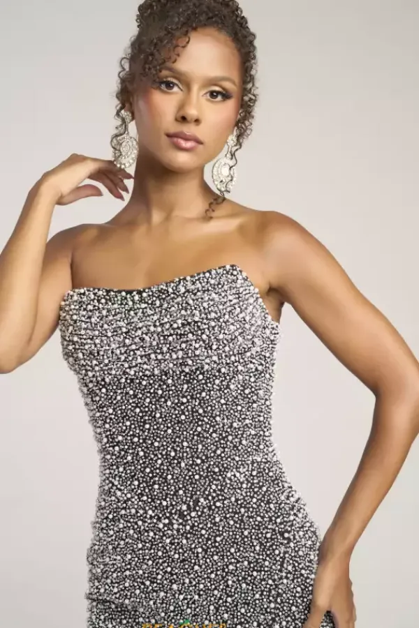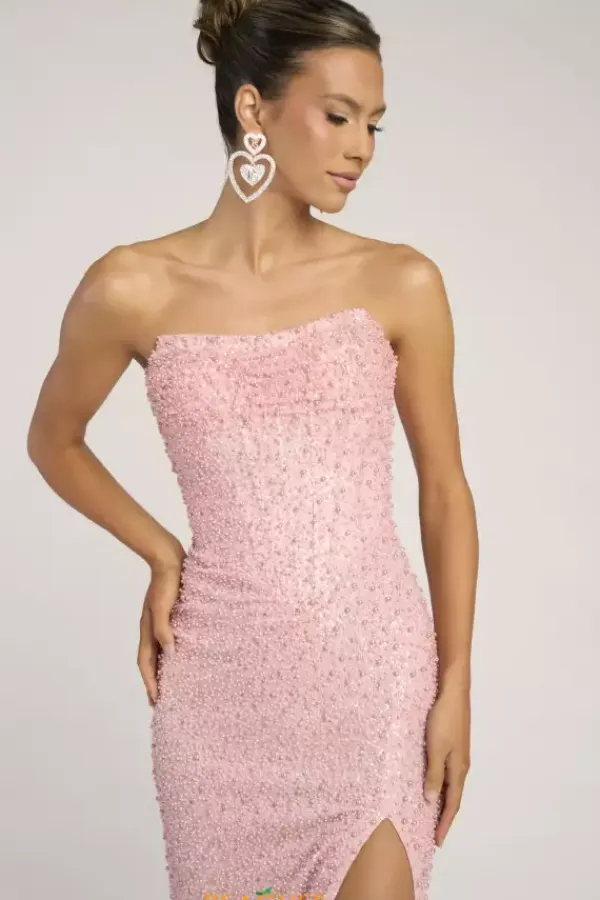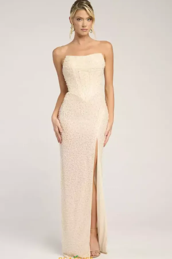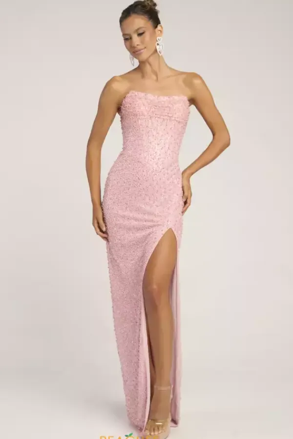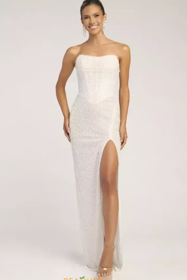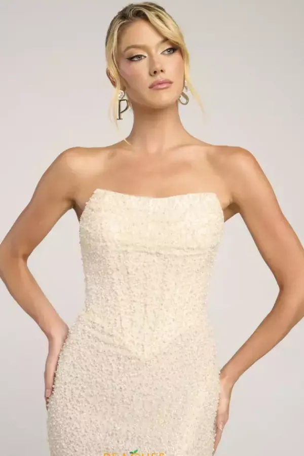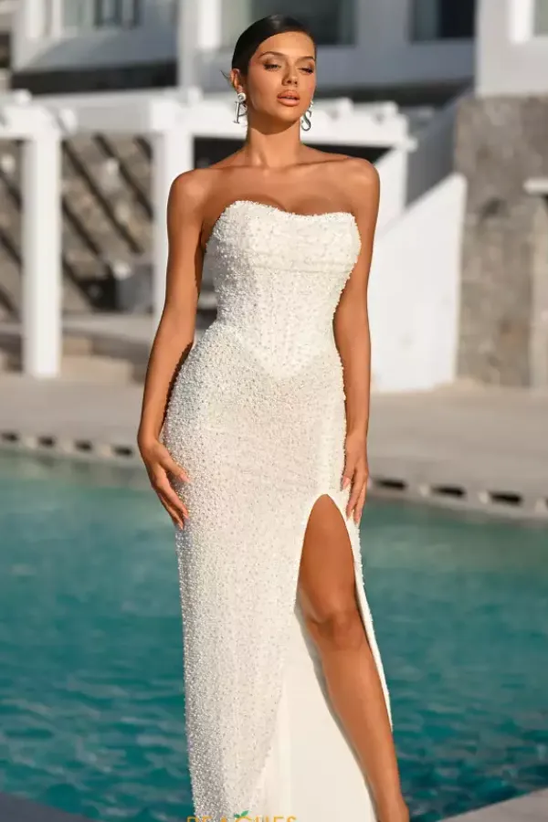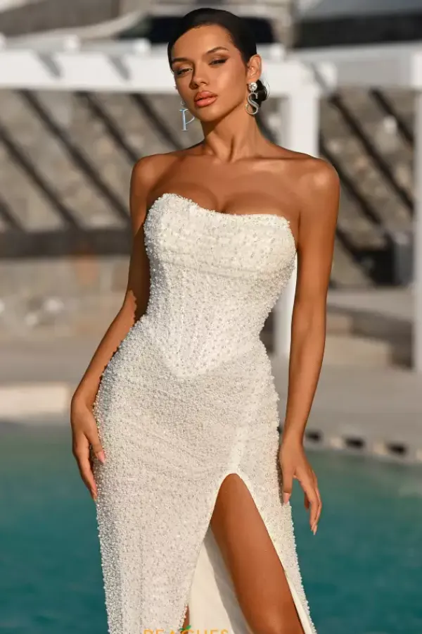 Look picture perfect at this years prom in this absolutely gorgeous Portia and Scarlett long dress style PS26309E richly embellished with pearls and beads throughout. This scintillating gown showcases a strapless corset bodice with V waist, visible boning and zipper back. The long slim skirt has a high front slit and back sweep train.