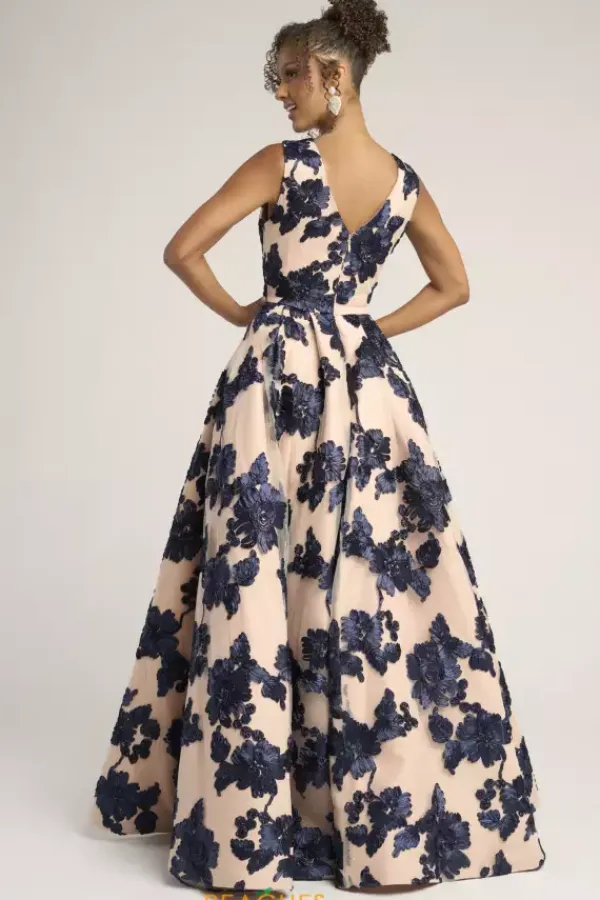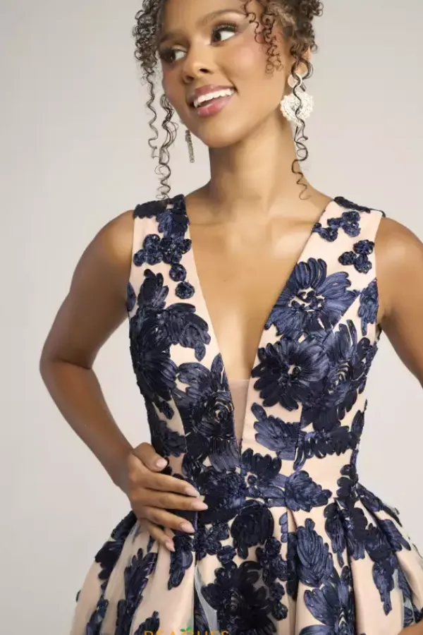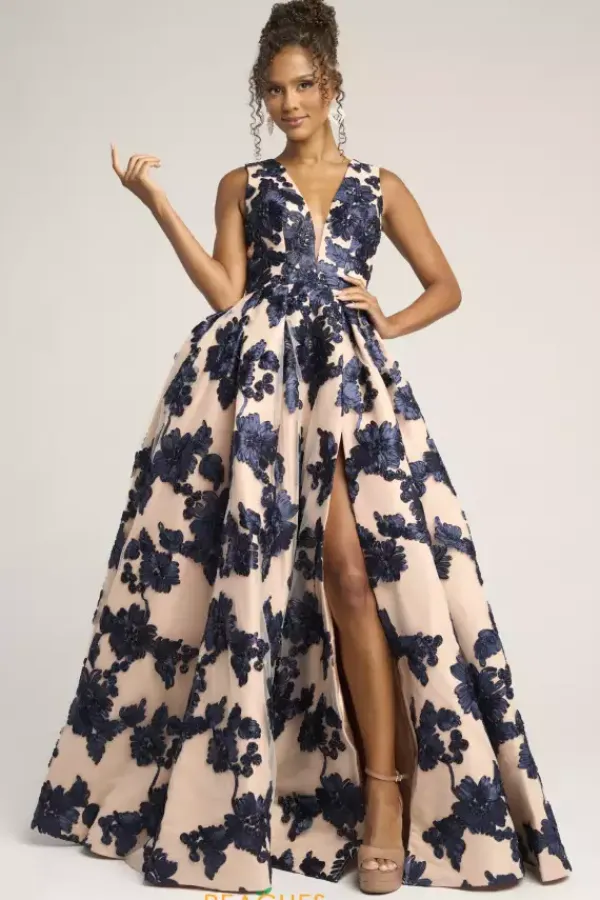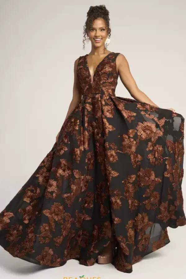 Be fabulous in this Portia and Scarlett A line dress style PS26312E. The novelty appliqued dress has a v neckline with thick shoulder straps and a mocked v open back, The skirt falls from the small of your waist with just the right amount of fullness. A front thigh high slit makes it easy to dance the night away.