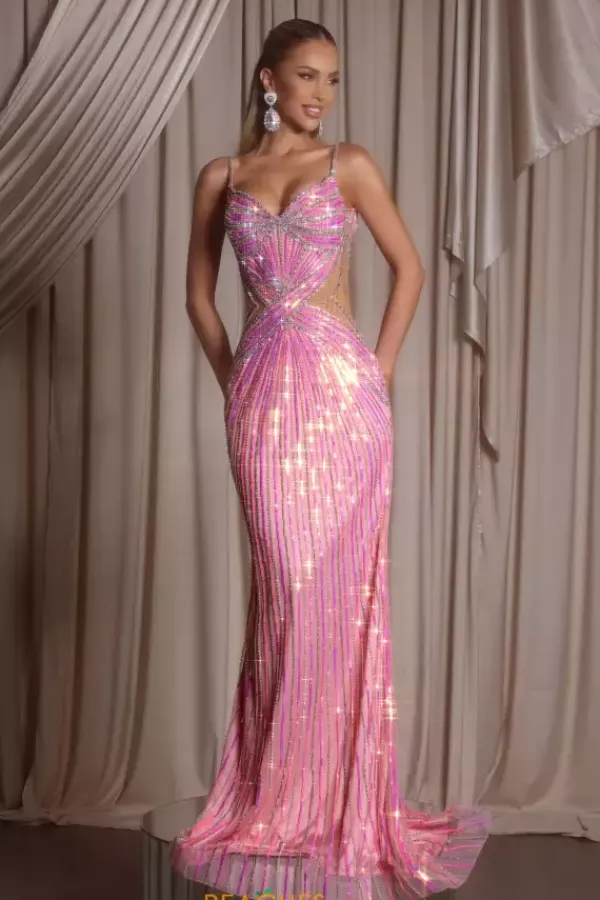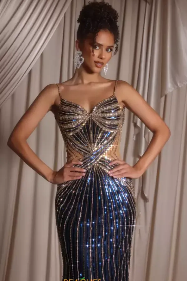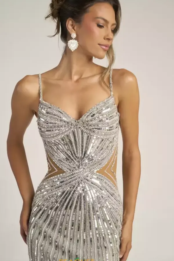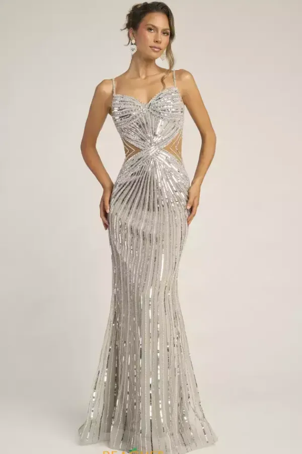 Sparkle like the night sky in the beautiful Portia and Scarlett dress style PS26405C. This long fitted silhouette dress has a sweetheart neckline and thin beaded shoulder straps. The wraps style waist with beads and sequins in ultra flattering with sheer illusion cut out sides. The skirt bring the beading all the way down.
