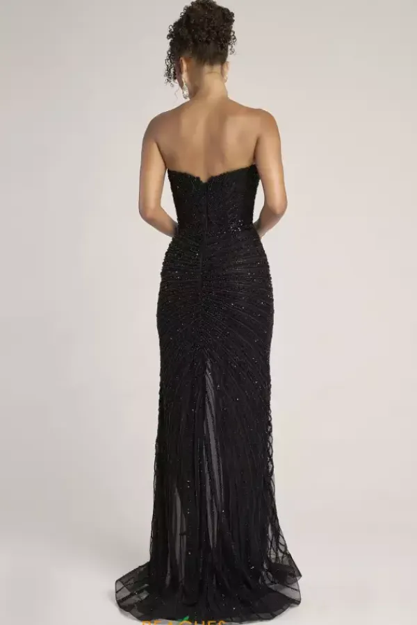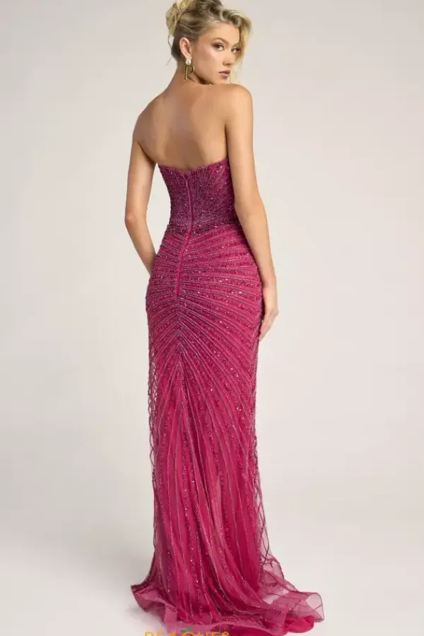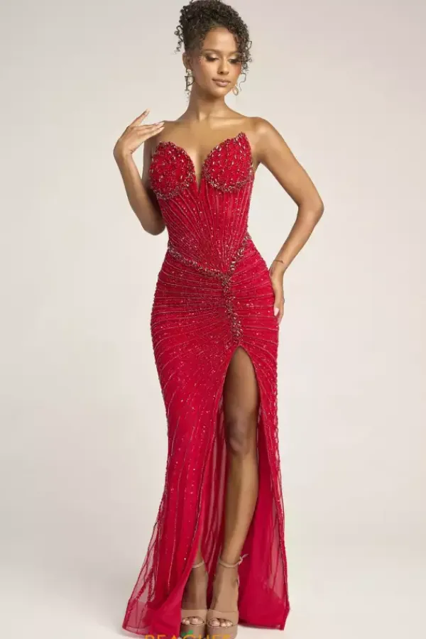 Radiate elegance when you wear this mesmerizing Portia and Scarlett long dress style PS26416C embellished with lines of tonal beading and stones. This scintillating gown showcases a strapless corset with a deep V neckline and low zipper closure back. The long, slim skirt has a high front, side slit and small sweep train.