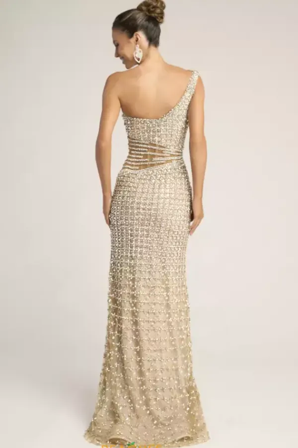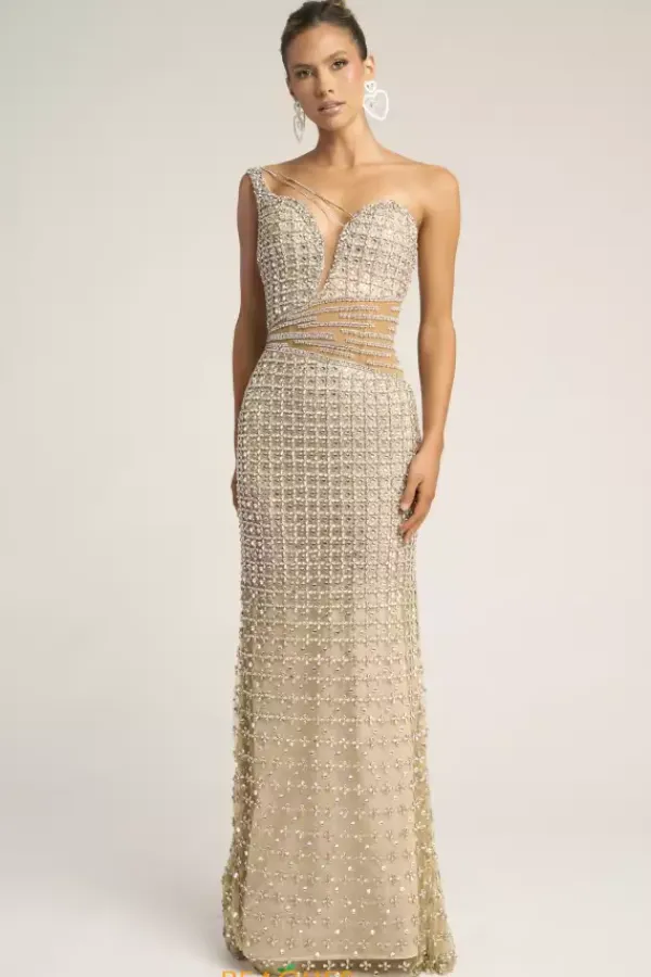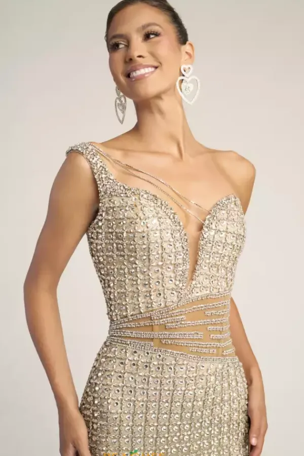 Sophistication exudes when you wear this elaborate Portia and Scarlett long dress style PS26434C drenched in an intricate pattern of crystals and beads. This impeccable gown showcases a fitted bodice with an asymmetrical neckline and single shoulder strap. The long, straight skirt flows beautifully to the floor.