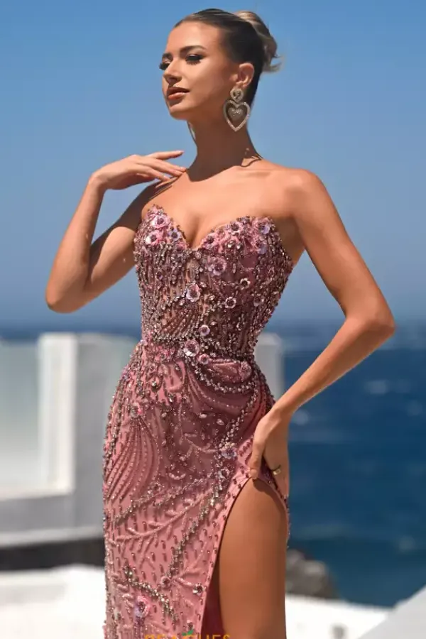 Step off the red carpet and into your special event in this striking Portia and Scarlett long fitted dress style PS26442C. The strapless v neckline dress is bedazzled with the best bead work. Three dimensional flowers made from sequins are showcases through out the dress. Available only in this stunning pink color.
