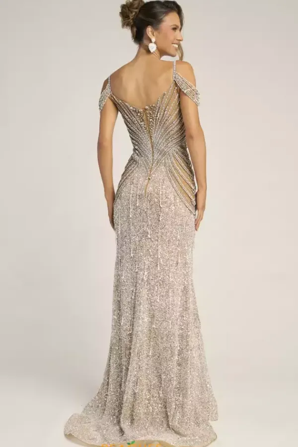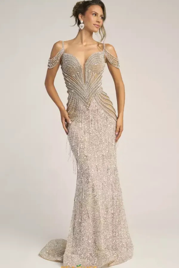 Look like royalty in this sophisticated Portia and Scarlett pageant dress style PS26449C. Various sizes of sparkling silver stone accents create mesmerizing patterns throughout the plunged zipper bodice and off the shoulder draped cap sleeves. Delicate sequins and fringe beadwork adorn the entire nude based long skirt.