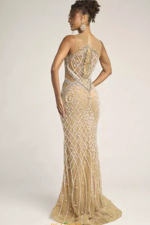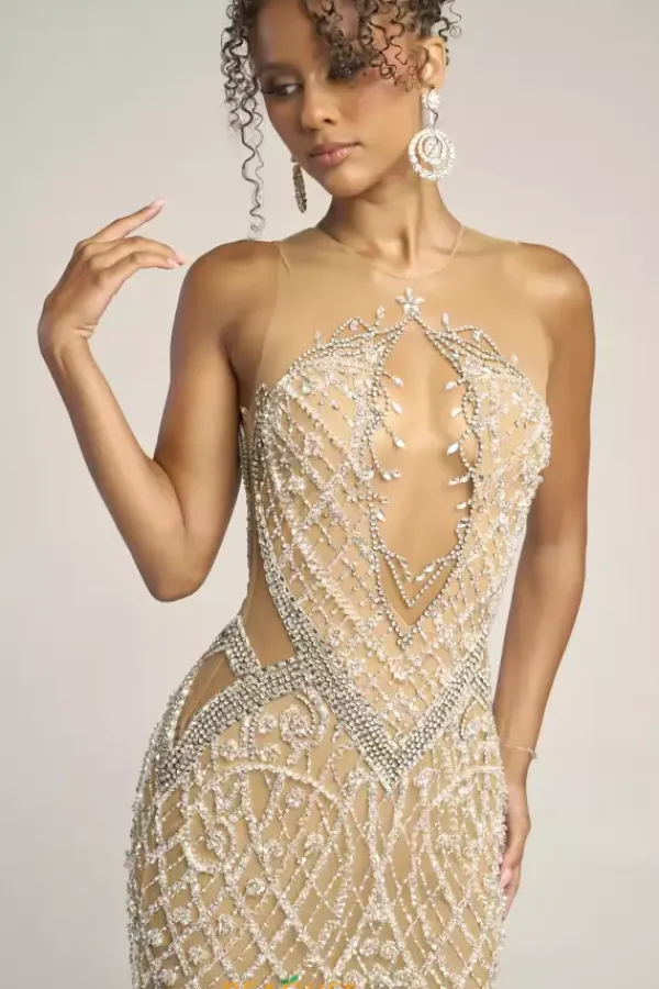 Have a vintage inspired moment in this gorgeous Portia and Scarlett long dress style PS26454C. Available only in this rich nude and silver combo, this high neckline dress made from sheer illusion to give you the look of wearing just bead work. The intricate beading is made of up pearls, rhinestones and sequins.