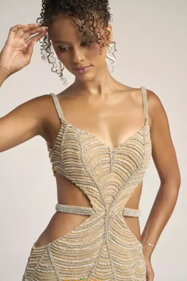 Rows and rows of beading give this Portia and Scarlett long dress that perfect vintage vibe. Style PS26455C has a v neckline with thick shoulder straps. The sides of the dress are cut out with a matching beaded straps that wraps around to define your shape. The endless beadwork gives a sleek old hollywood look.