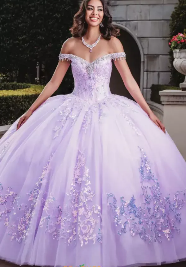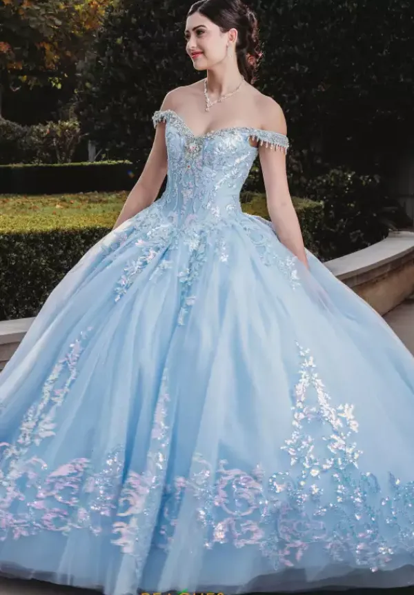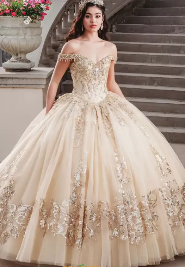 Fascinate all in sight in this sensational Amabella ball gown Q1000. All eye will be on you in this ravishing dress that features a modest sweetheart neckline and full ball gown skirt. Delicate off the shoulder cap sleeves highlight a lovely fringe embellishment. The fitted corset bodice is adorn in lavish lace appliques that cascade onto the skirt. Made in a tulle fabric, an alluring detachable train makes for a marvelous exit.