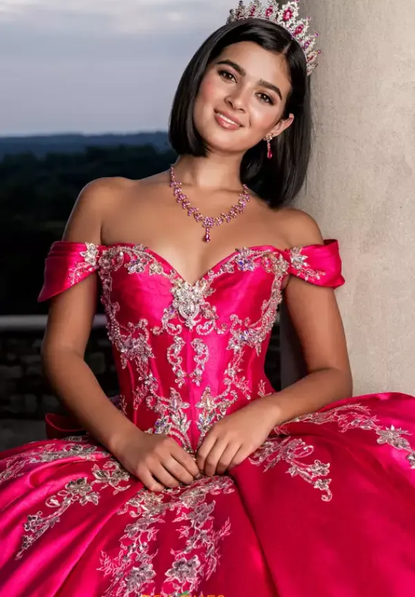 Make a grand entrance in this timeless ballgown by Amabella, style Q1025. This luxurious gown features a strapless sweetheart neckline with detachable off the shoulder sleeves, and a beautiful lace up corset bodice that will enhance your figure to perfection. Made with divine satin material, this gown is adorned with beadwork and applique detailing that give an elegant look. This breathtaking dress includes a stunning train and lovely bow that add the perfect finishing touches.