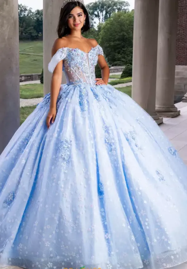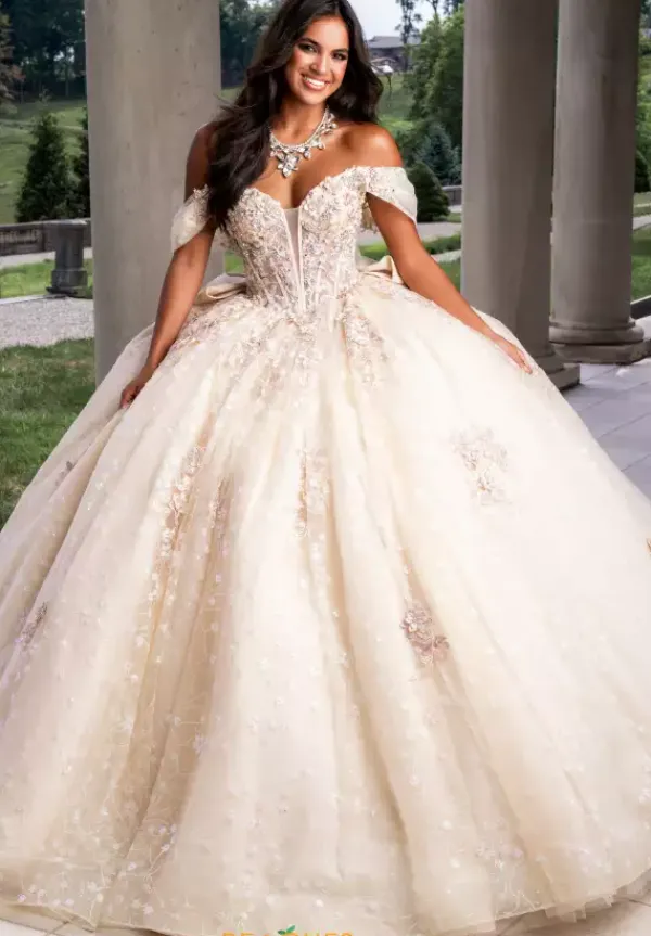 Have everyone gleaming over you as you wear the remarkable ball gown style Q1029 by Amabella. Featuring the fitted illusion bodice beautifully adorned with lace applique and illuminating beadwork. Showcasing detachable cap sleeves and a lovely bow to decorate the back of the gown. HIhglighitng the full tulle skirt displaying glittered applique and a dramatic overlay sleeve to fly effortlessly in the wind.