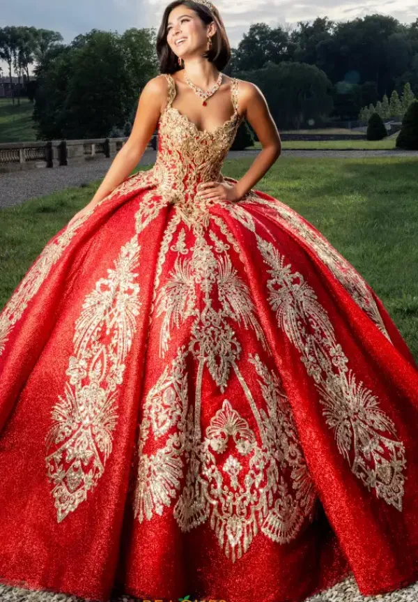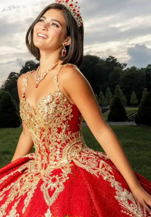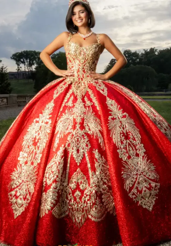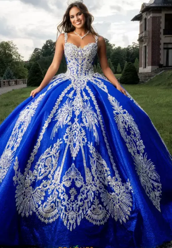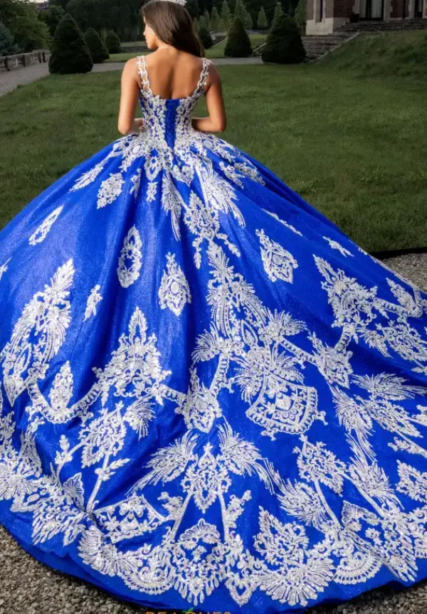 Feel like royalty in this stunning ball gown at your event, designed by Amabella, style Q1033. This gorgeous dress features detachable sleeves and a marvelous off the shoulder sweetheart neckline complement by beautiful straps that can also be detachable. Made from glitter tulle material, this dress is fully adorned with mesmerizing applique detailing and dazzling beadwork material. This dramatic captivating long train would leave your guest memorized.