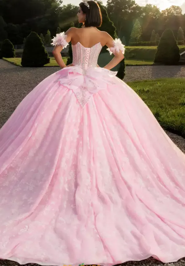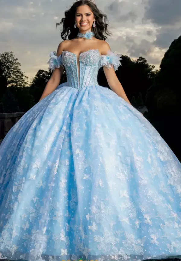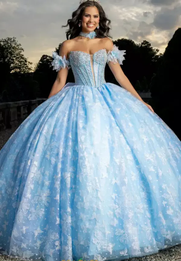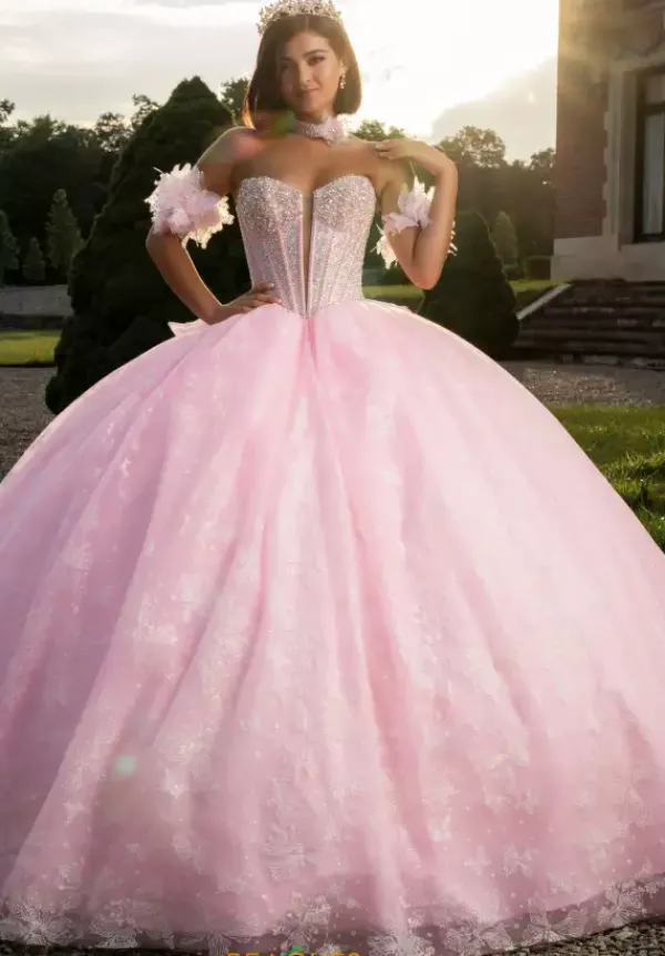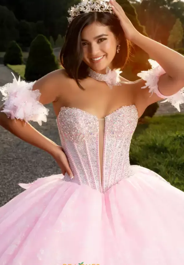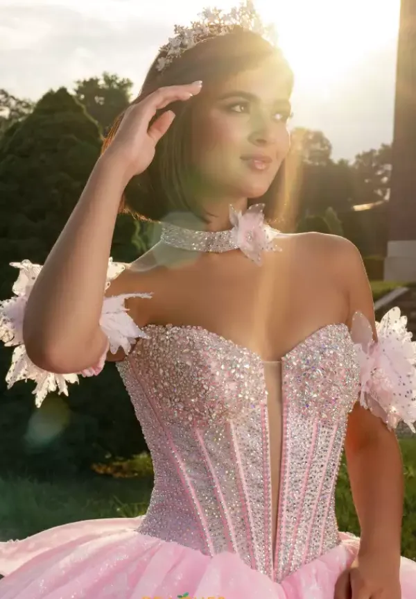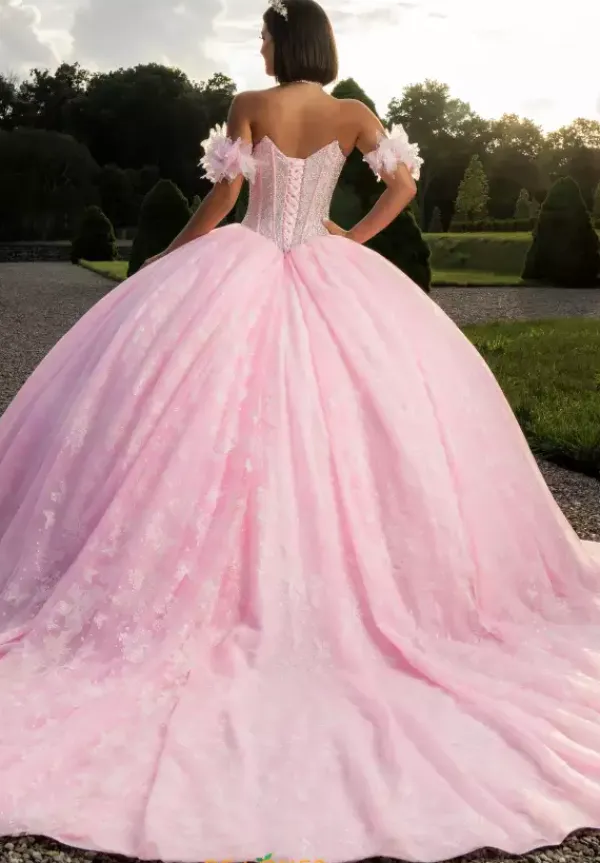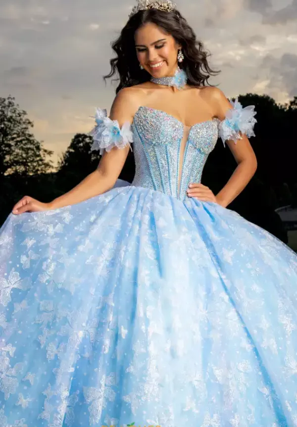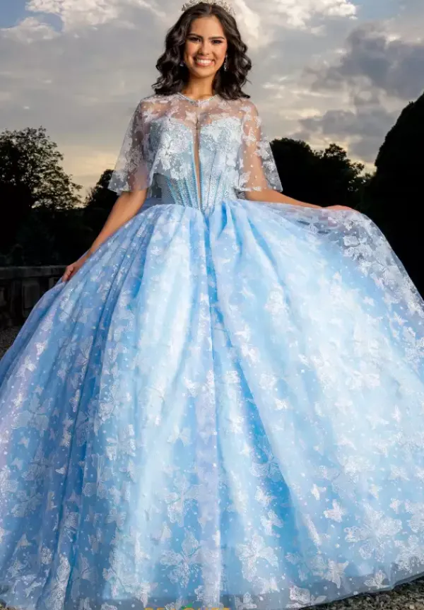 Allure attention when you wear this beautiful dress by Amabella style Q1036. This Quinceanera dress features a strapless scoop neckline with a mesh panel paired with tulle cap sleeves that match the choker necklace. The corset is supported with a lace up that flows to reveal a cute bow. The skirt contains beading and glitter tulle with butterfly novelty patterns. The finishing touches are a beautiful capelet that match the skirt and a stunning train.