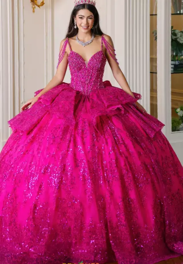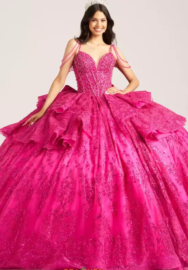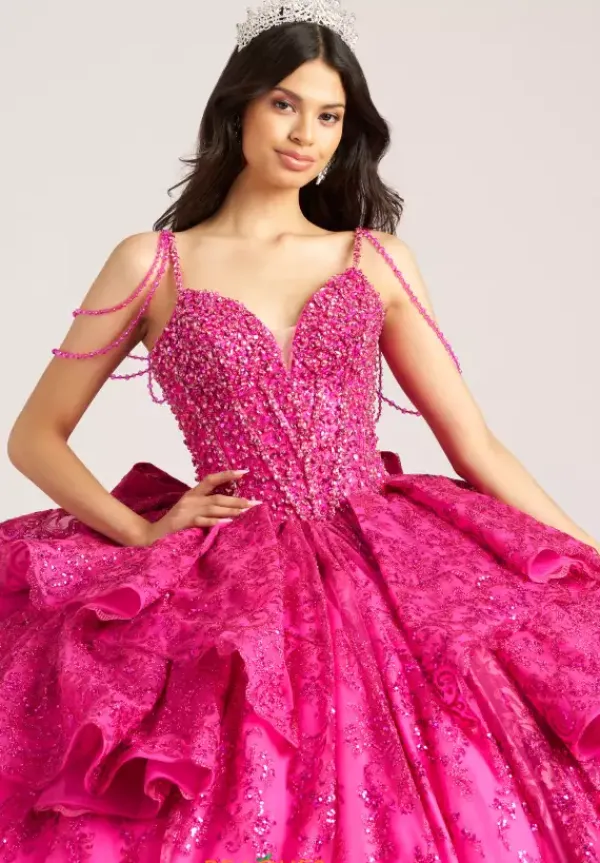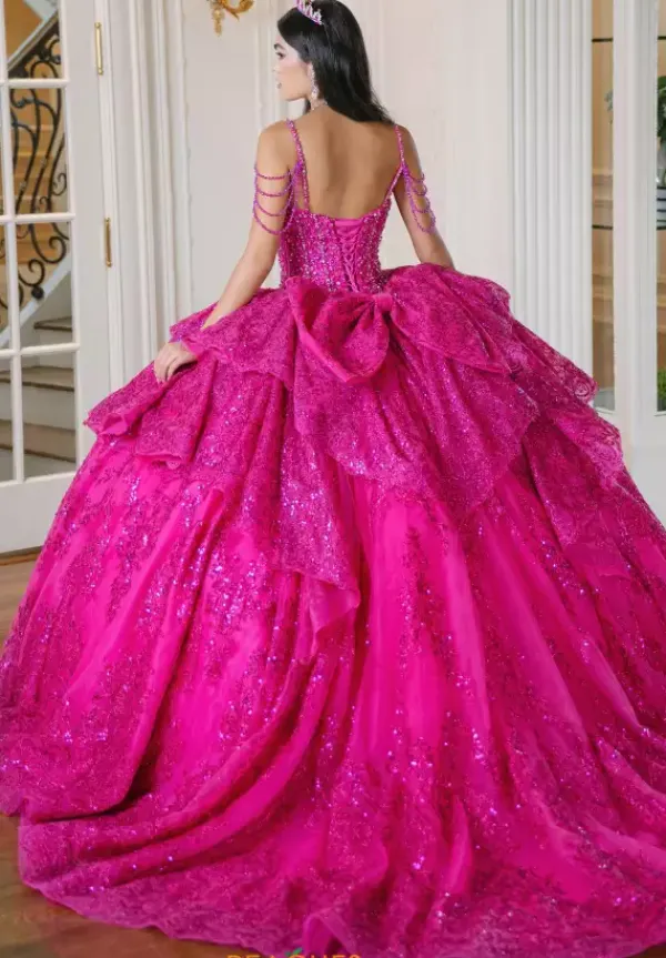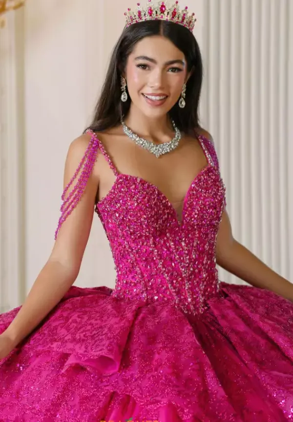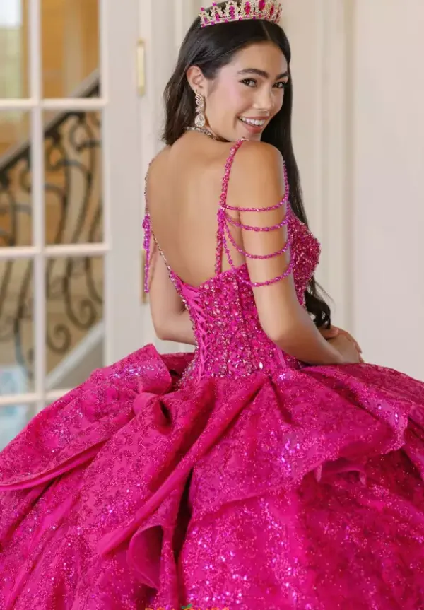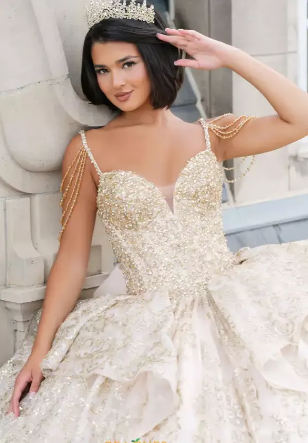 Have everyone breathless when you walk in wearing this Amabella gown style Q1084 to your Quinceanera. This gorgeous sparkling corset bodice is bejeweled with all the right beading. The thin shoulder straps have hanging off the shoulder cap like sleeve straps beaded as well. The glitter tulle ball gown skirt has a detachable bow in the back.