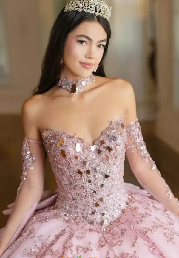 Be bold and glamorous in this striking Amabella ball gown style Q1093. The intricate long waisted strapless v neckline bodice has cut glass gem work over sparkling lace sequins. Detachable long sleeves give you a two in one look with a matching chocker necklace. The full glitter tulle ball gown skirts has a detachable bow in back.