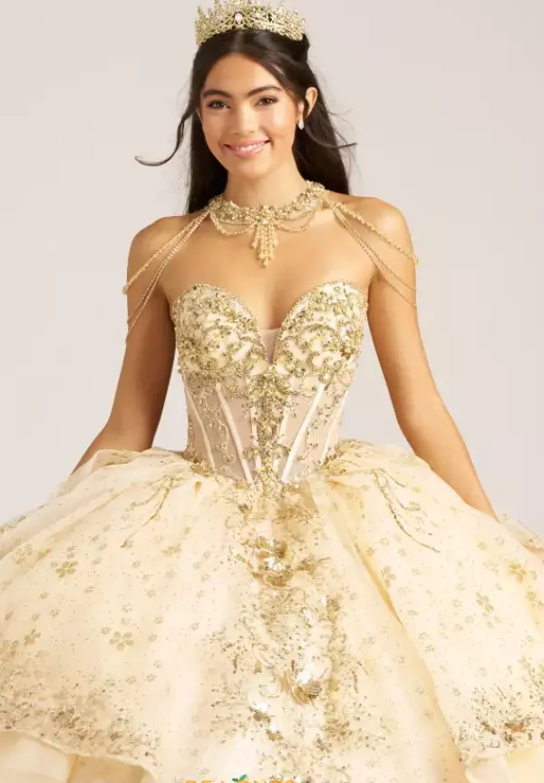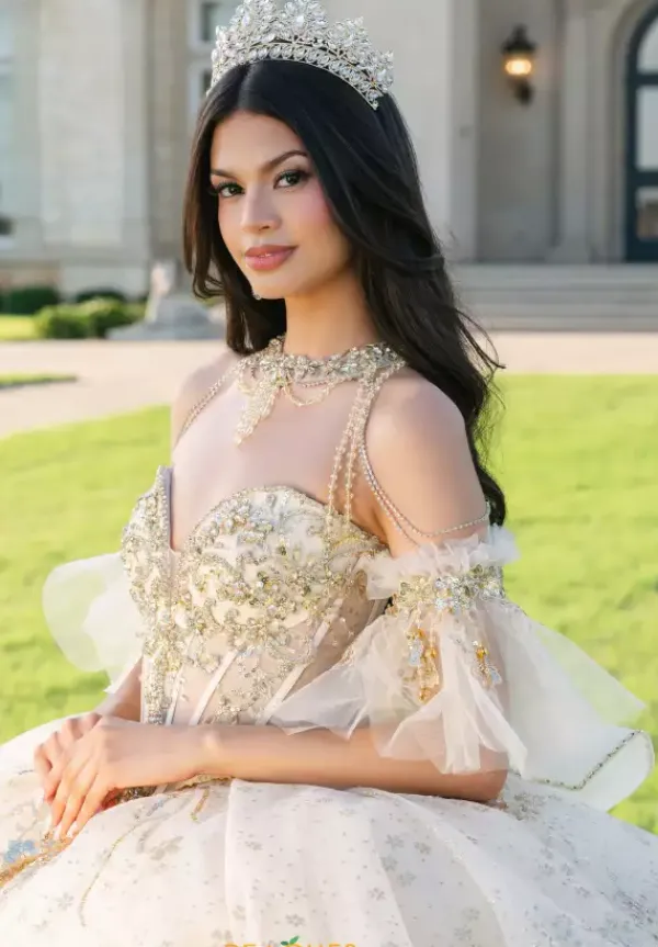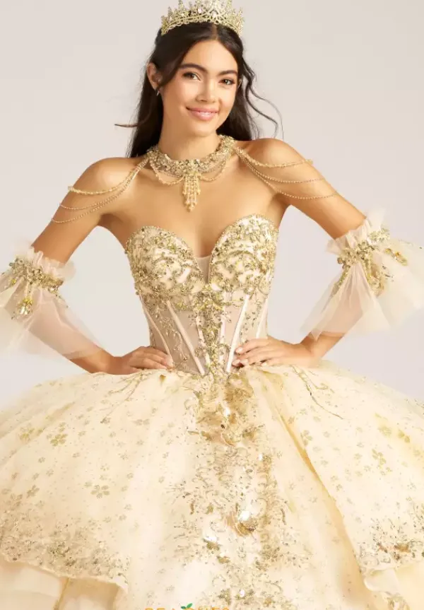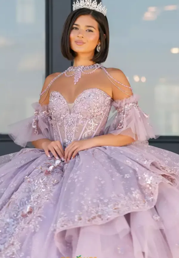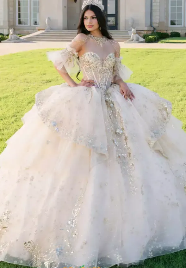 Feel like a modern day fairy tale princess in this chic Amabella ball gown style Q1096. This strapless sheer illusion long waisted bodice has a strapless sweetheart neckline. A gorgeous chocker neckline has hanging fringe beaded that drapes your shoulders. Detachable cap sleeves add to the gorgeous look with is completed by the glitter tulle on the skirt.