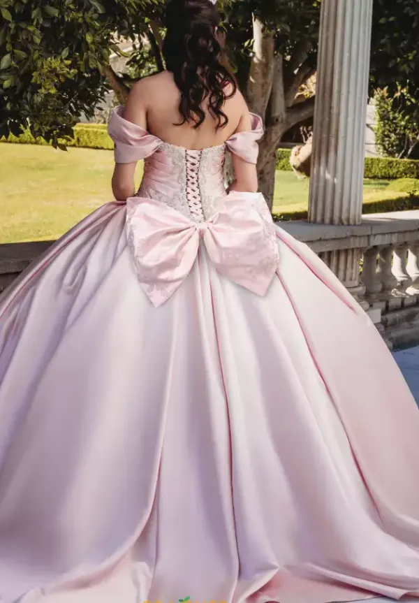 Exude regality in Amabella ballgown style QA101, made out of lush satin material that looks effortlessly elegant. Displaying an incredible corset bodice with ruching and graceful applique complimented by intricate beadwork. The neckline can be worn as strapless or with lovely off the shoulder cap sleeves. The voluminous skirt is topped off with a fabulous bow. Detachable off the shoulder sleeves and bow included.