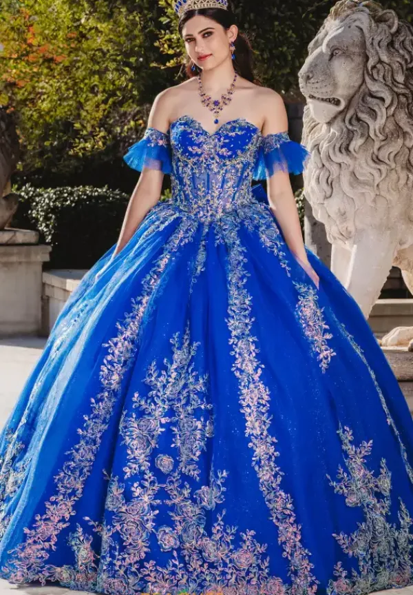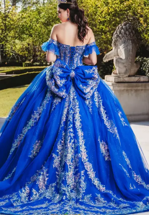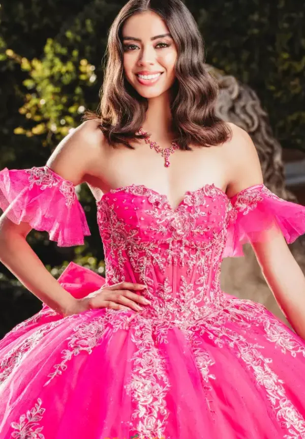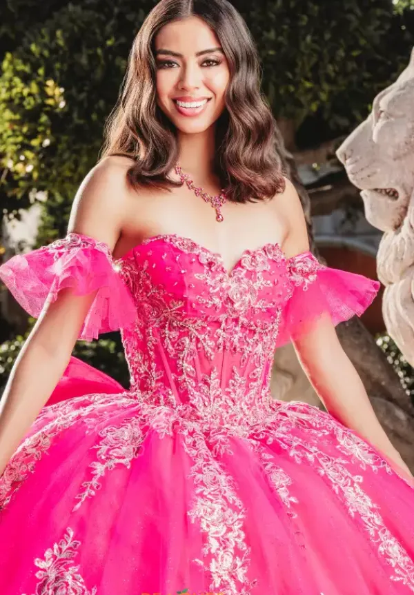 Incredibly eye catching Amabelle Quinceañra dress style QA103 features a mesmerizing fitted corset bodice with captivating beaded applique atop tulle and corset boning. Elegant ap sleeves elevate the strapless sweetheart neckline. More stunning applique cascades down the glitter tulle skirt for a dramatic effect, perfectly finished with a bow. Includes detachable bow and removable off the shoulder sleeves.
