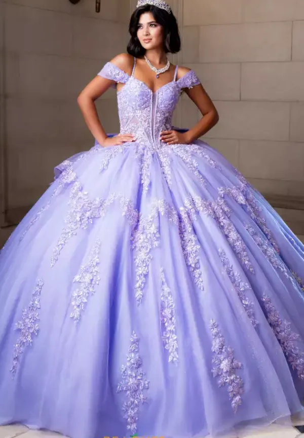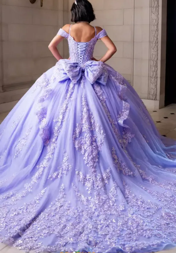 Be the talk of the night in this striking ballgown by Amabella, style QA110. This show stopping look features a sweetheart neckline with delicate straps and detachable off the shoulder cap sleeves, as well as a lace up corset bodice that will accentuate your shape beautifully. It is adorned with glistening beadwork, lace, and applique detailing that cascade down the voluptuous tulle skirt. This luxurious gown has a captivating train and chic bow that will give you that fabulous look all night long.