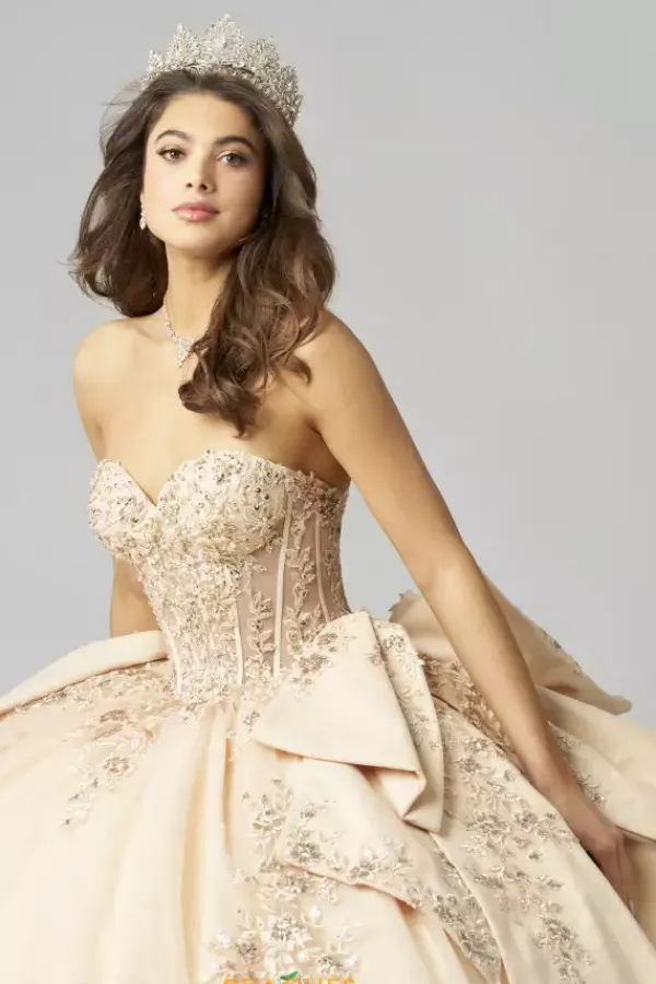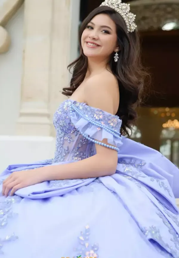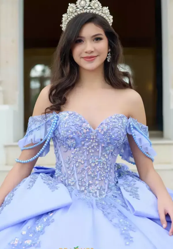 You can never have enough bows with this Amabella ball gown style QA155. This quinceanera dress has a off the shoulder cap sleeve that is detachable from the sweetheart neckline long waisted bodice. Two large bows sit at the hips of the skirt as well as the back of the dress. Gorgeous shimmering lace appliques adorn the bodice and continue onto the full tulle skirt.