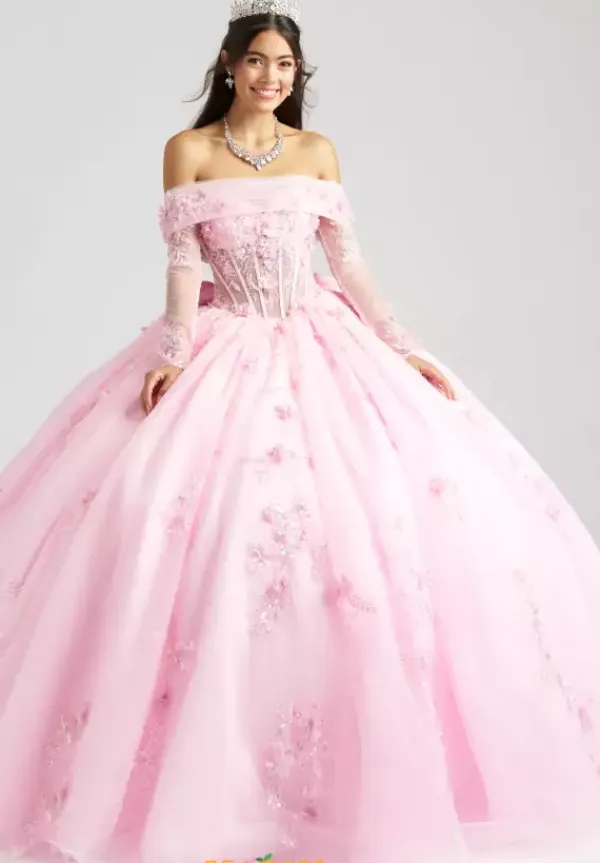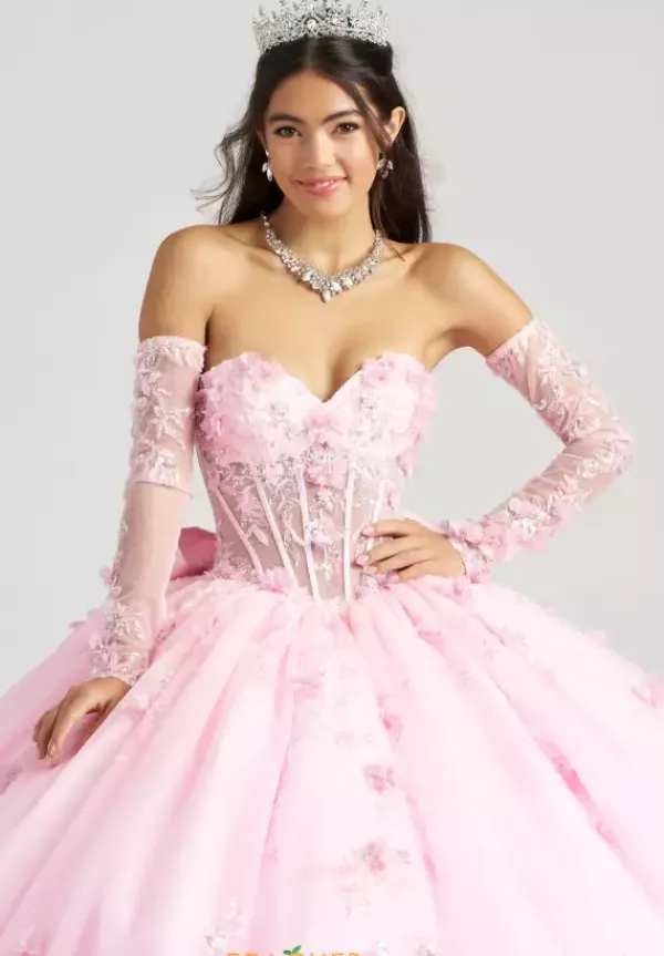 Feel regal and gorgeous in this Amabella ball gown style QA165. The strapless sweetheart bodice is made from a sheer illusion with striking floral appliques throughout. A detachable shawl can be worn over the bodice with detachable sleeves to give it a two in one look. The full tulle ball gown skirt has detachable bows in the back as well.
